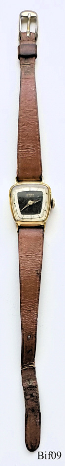 A Bifora ladies handwind watch with the Bifora 55 caliber. Signed front: ”BIFORA, 17 Rubies”, back: ”20 Microns, Stainless Steel Back”, inside: “55”. Caliber: Bifora 55, brown leather band.