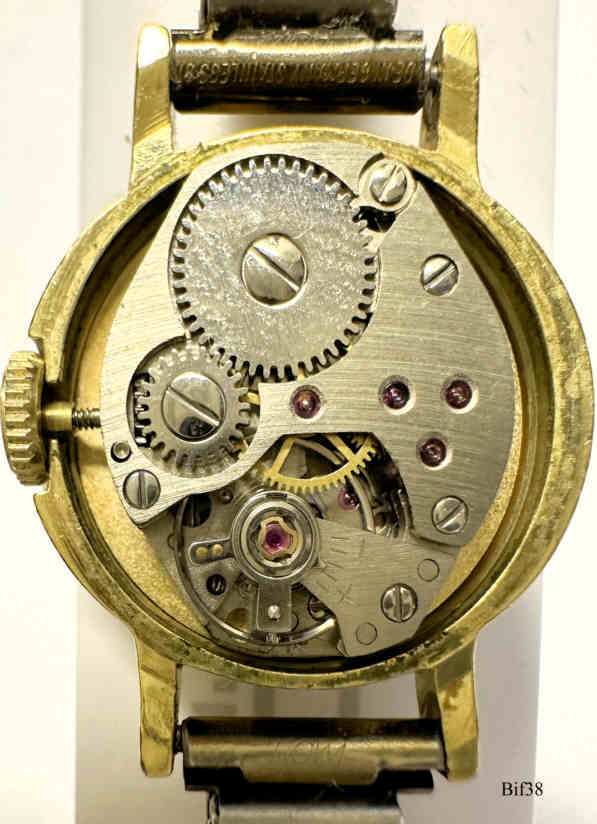 Dies ist eine Bifora Handaufzugs Uhr mit dem Bifora 691 Werk, Modell “Day/Night”. Beschriftet vorn: ”BIFORA, 17 Juwels, Germ. Made”, hinten: “Stainless Steel Back”, innen: “€¯B, 691”, Kaliber: Bifora 691, FixoFlex Band. Die Bezeichnng Day/Night bezieht sich auf die Punkte auf dem Zifferblatt.