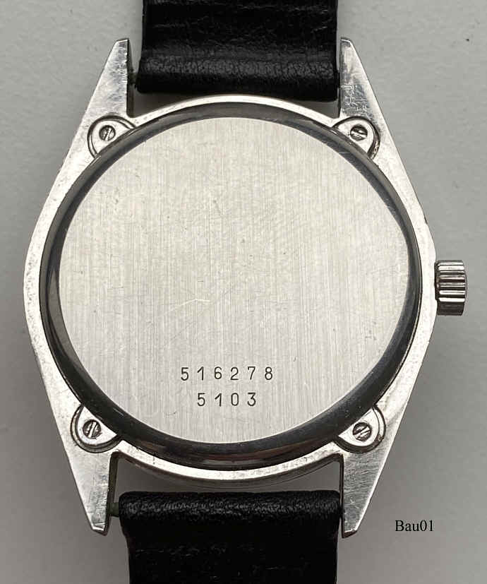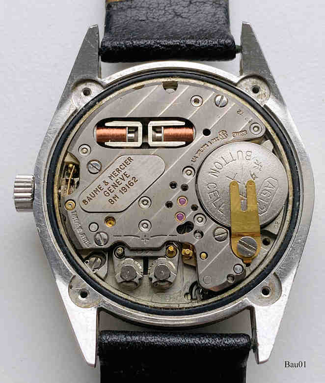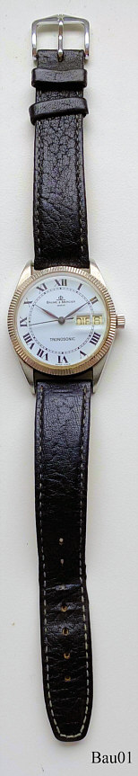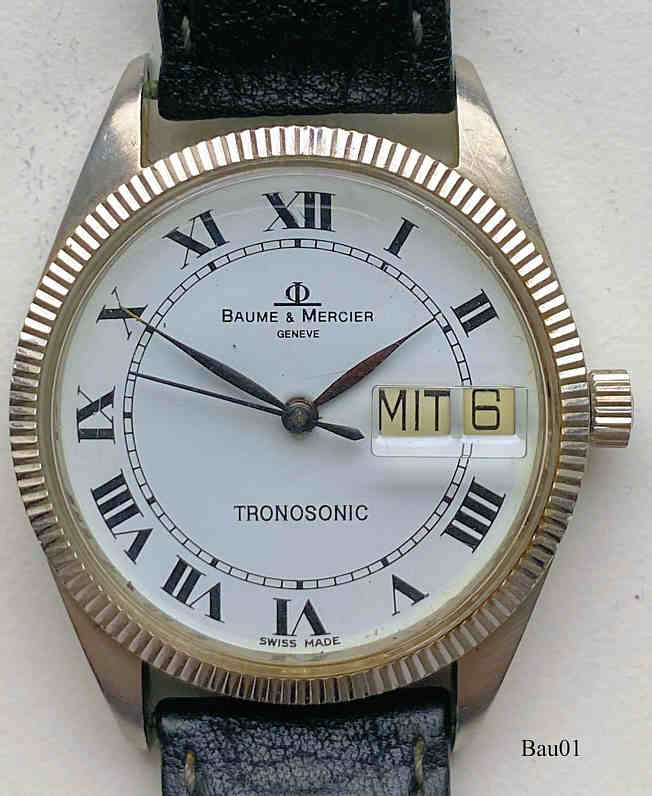 Dies ist eine Baume&Mercier Tronosonic, ESA 9164, Referenz Nr.: 5103, schweres Hartmetall Gehäuse, stainless steel back, Glas mit Datumslupe, Tag und Kalender bei der 3. Bezeichnung auf dem Zifferblatt: “Baume&Mercier, Geneve, Tronosonic, Swiss Made”€¯, In der Rückwand: ”€¯516278, 5103”€¯, innen: ”Baume&Mercier, Geneve, BM 19162”€¯ FalschesLabel (64)