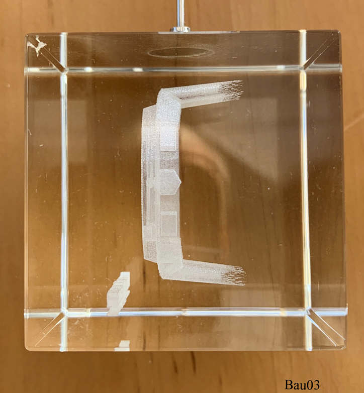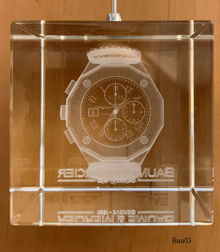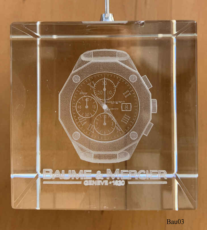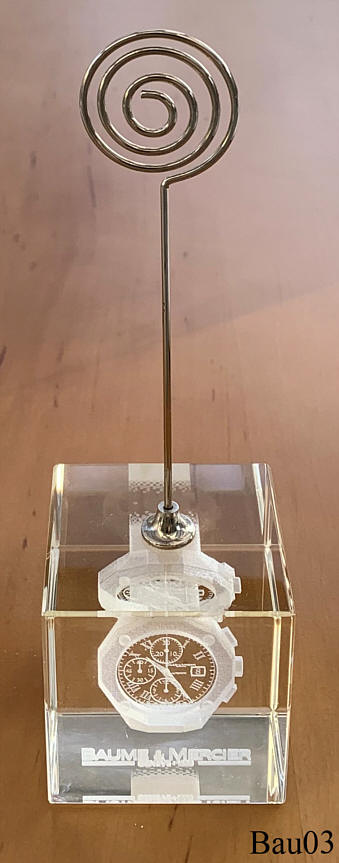 Dies ist ein Baume&Mercier Visitenkarten Halter mit einer 3D Laserskulptur eines Riviera Chronographen (Ref. 65541). Bezeichnung auf der Front: ”€¯Baume&Mercier, Geneve,1830”.