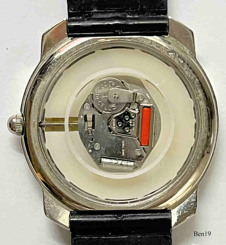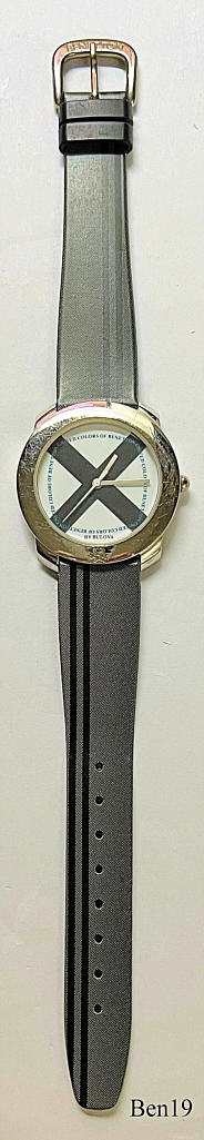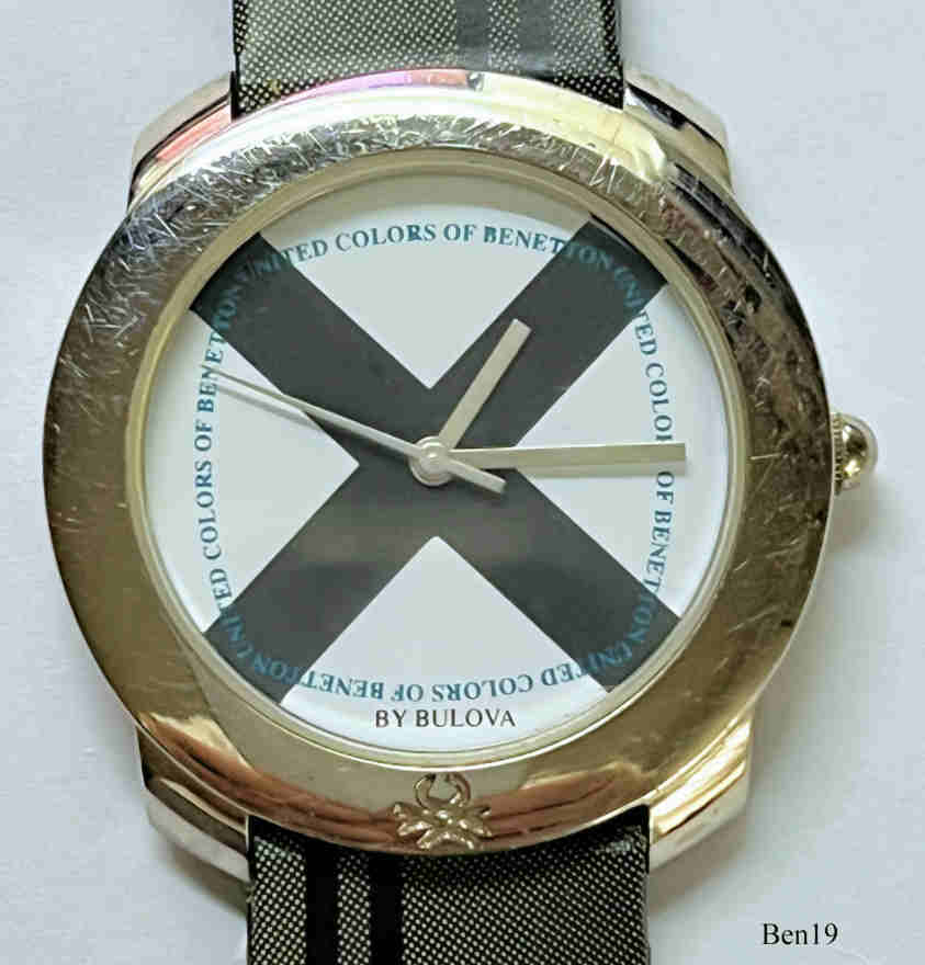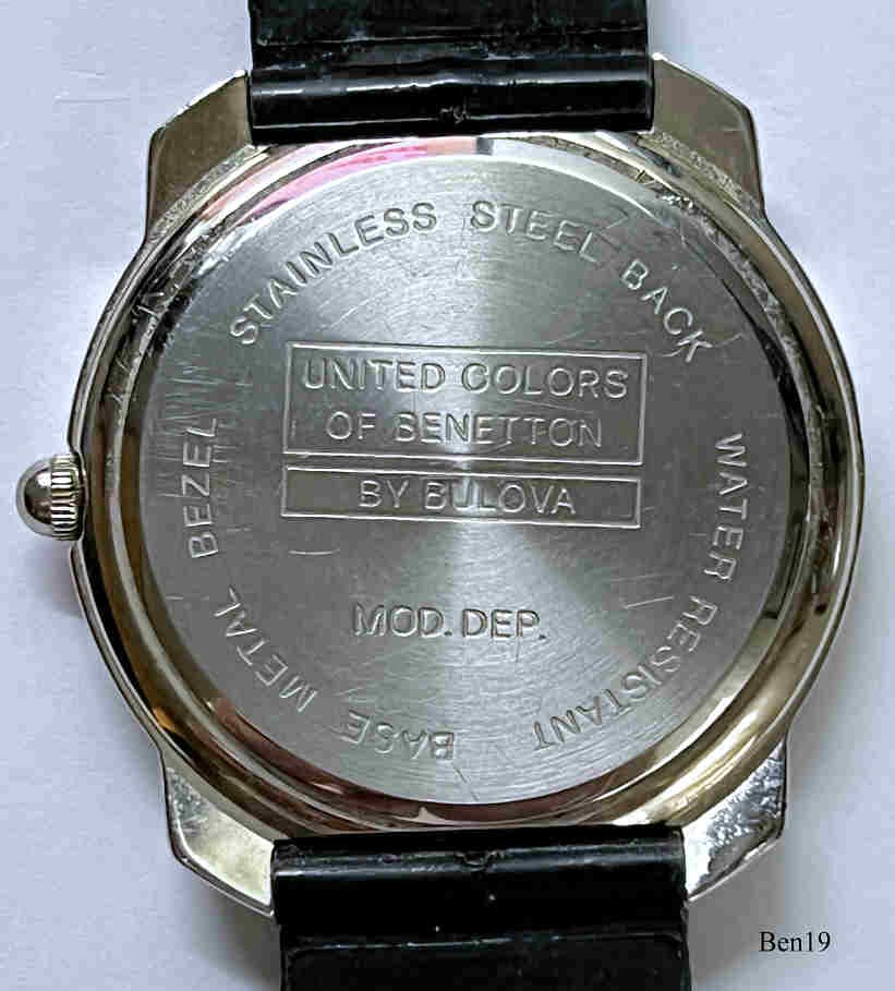 Eine Benetton by Bulova, Beschriftet vorn: ”United Colors of Benetton by Bulova”€¯, hinten: ”€¯United Colors of Benetton by Bulova, Stainless Steel Back, Water Resistant, Base Metal Bezel, Mod. Dep.”€¯, innen: ”€¯Swiss parts, one Jewel, Ronda, ODA”€¯, graues Plastikarmband mit Benetton Schließe.