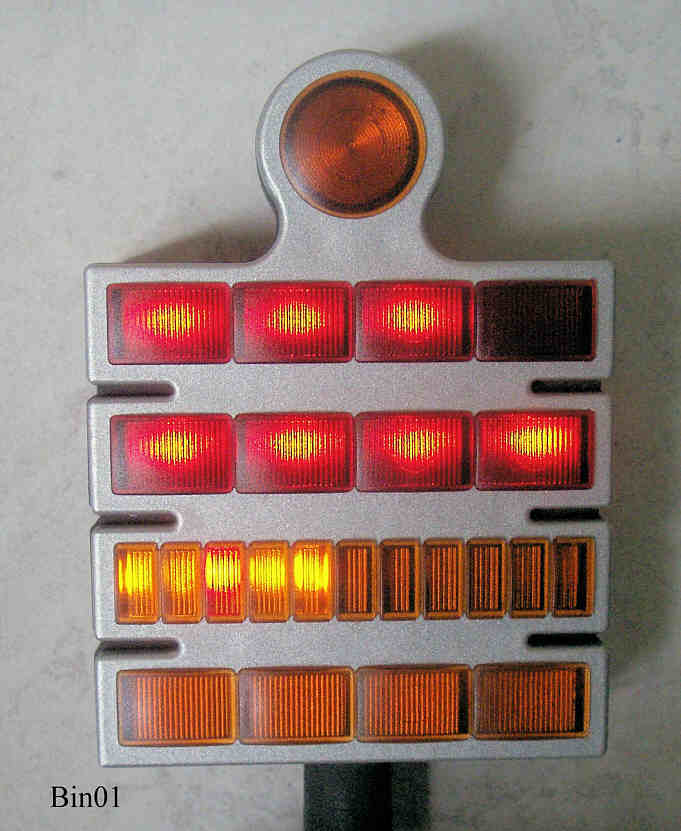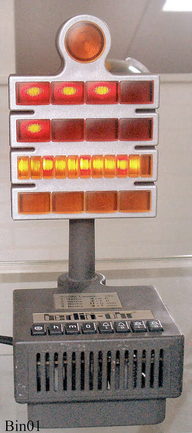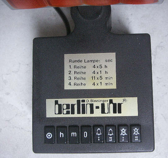 Dies ist das Modell der “Berlin Uhr”, die von D. Binninger im Auftrag des Berliner Senats entwickelt und am KuDamm aufgestellt wurde. Heute steht sie hinter dem Europa Center. Diese Uhr wird auch Mengenlehre Uhr genannt, da die Zeit durch addieren der verschiedenen Lichtbalken abgelesen wird. Die obere Reihe zeigt die 5-Stunden Intervalle an, die zweite Reihe die Stunden, die dritte Reihe zeigt die 5-Minuten wobei jede dritte LED in rot abgesetzt ist, damit man die 15 Minuten Intervalle besser erkennen kann, die untere Reihe zeigt dann die Minuten. Die runde LED an der Spitze blinkt im 2 Sekundenrhytmus. Somit ist die Zeit auf der linken Abbildung: 3x 5 Stunden plus 1x 1 Stunde gleich 16 Uhr und 10x 5 Minuten + 0x 1 Minute gleich 16 Uhr 50 Minuten. Auf dem mittleren Bild nach gleicher Logik: 3x 5 Stunden + 4x 1 Stunde + 5x 5 Minuten +0x 1 Minute gleich 19 Uhr und 25 Minuten. Ganz einfach, richtig? Das Modell trägt die Seriennummer 16934 und wurde in Berlin in den Souveniershops für 100,- DM verkauft.