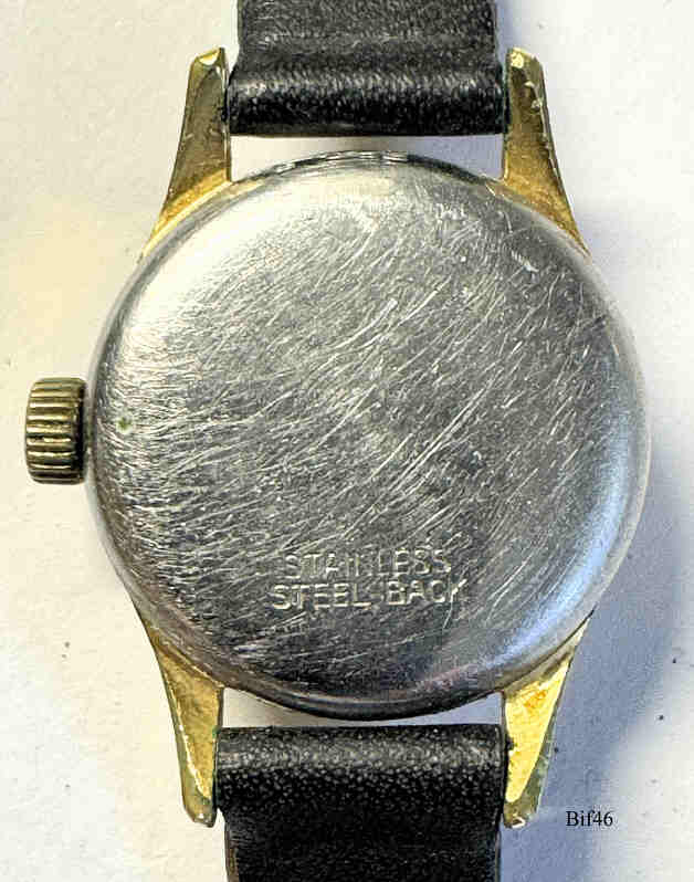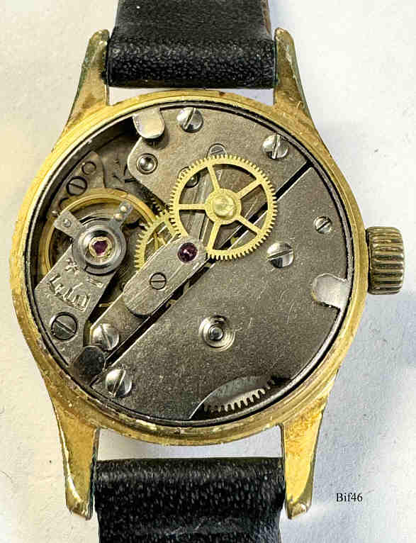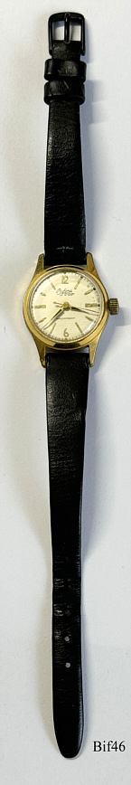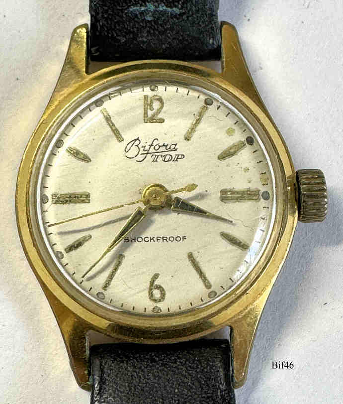 Dies ist eine Bifora Handaufzugs Uhr mit dem Bifora 934 Werk, an den Zeitgeschmack angepasst durch eine Zentral Sekunde. Dafür wurde die Kaliber Bezeichnung durch ein SC modifiziert. Beschriftet vorn: ”¯BIFORA, Top, Shockproof”, hinten: ”Stainless Steel Back”, innen: “€¯B, 934 SC”,€¯ Kaliber: Bifora 934 SC, Schwarzes Lederband.