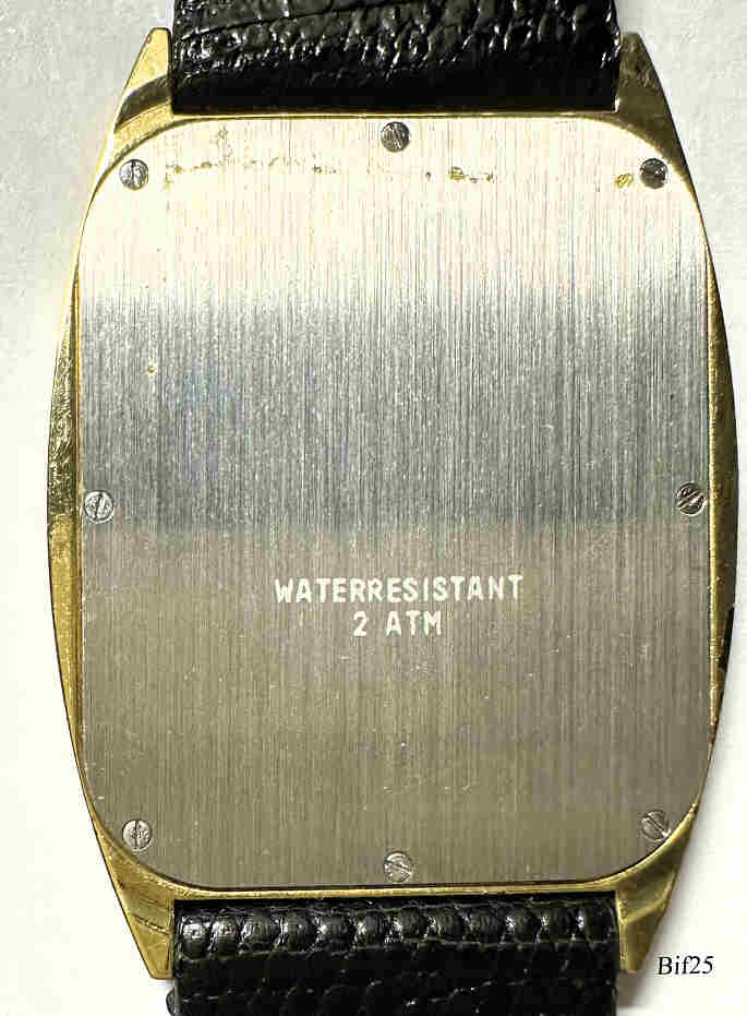 This is a Bifora quartz watch, using the slim-line movement B18 of Bifora. At the market placement it was the slimmest watch in the world with 3,0mm..  This B18 movement is a separate one, the alignment is at the side. The watch has a very attractive golden case. Signed front: ” BIFORA, Quartz” back:”Two Jewels, Unadjusted, W. Germany, B”, Caliber: Bifora B18”,