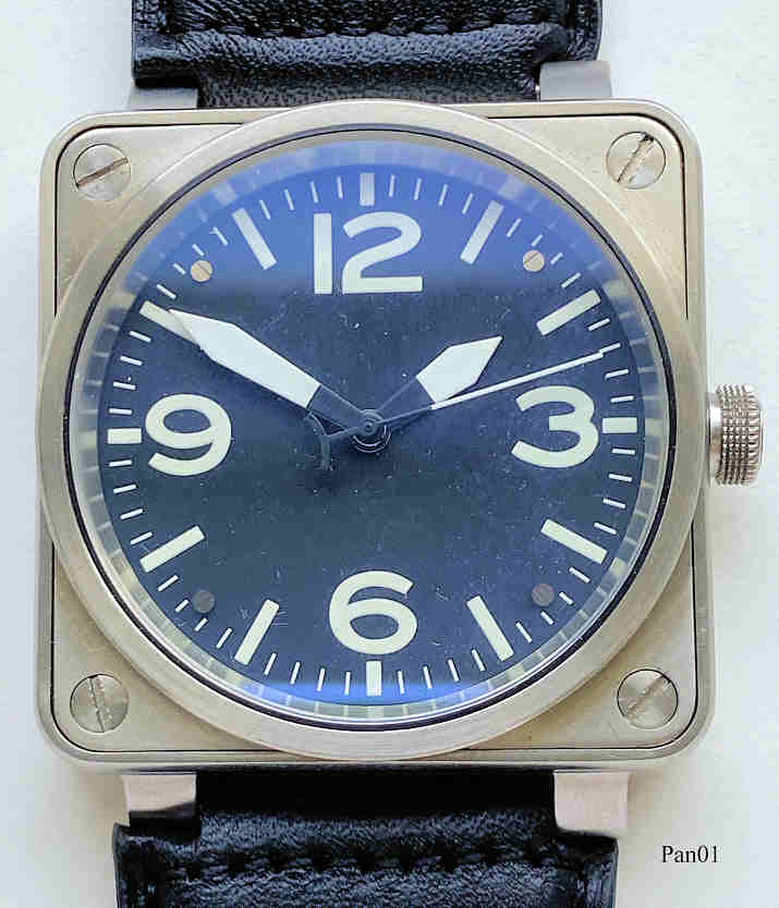 This Parnis Big Block Automatic watch is a true heavyweight in the Bell & Ross design. The Case is made from a stainless steel bock of 46 x 46 mm, and is opened from top through the 4 case screws. Inside is a normal automatic movement of unknown manufacture. Signed front: “”, back: “ PARNIS, Stainless Steel, 46 mm, Automatic, P0779/870413,Water Resistant”. Big black leather band.