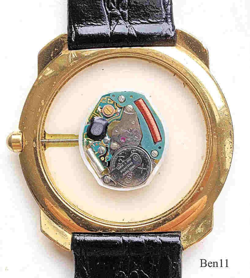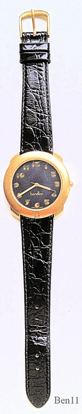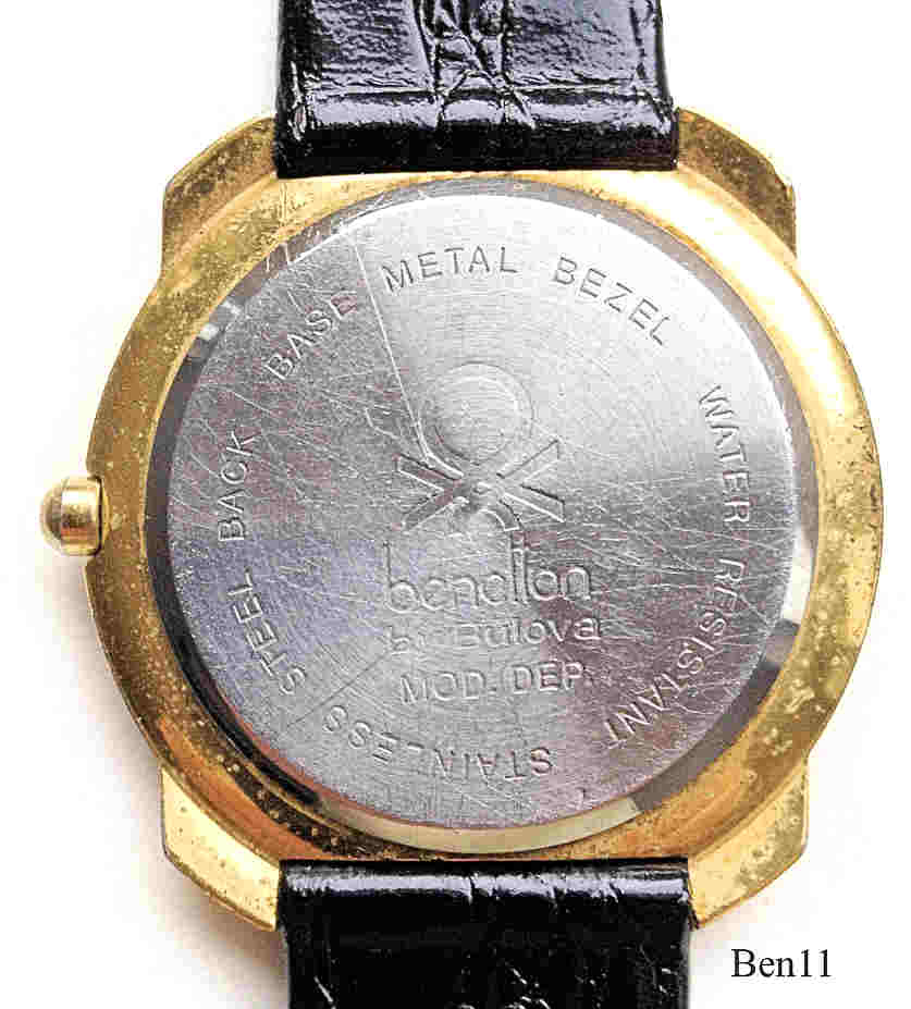Eine Benetton by Bulova mit schwarzem Zifferblatt und goldenen Ziffern, Beschriftet vorn: ”Benetton”, hinten: ”Benetton by Bulova, Mod. Dep., Stainless Steel Back, Water Resistant, Base Metal Bezel”, innen: ”Swiss parts, Unadjusted, one Jewel”, schwarzes Lederarmband mit neutraler Schließe.