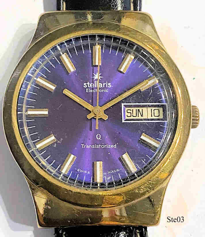 Eine Stellaris Electronic Uhr. Stellaris ist wohl die Eigenmarke der Kaufhauskette Sears, Roebuck & Co. Base Metal Gehäuse mit Edelstahl Boden. Das Uhrwerk ist ein Swissonic Werk, Kaliber 9158. Beschriftet vorn: “Stellaris, Electronic, Transistorized”, hinten: ”Water Resistant, Base Metal Bezel, Stainless Steel Back, Swiss”, innen: “Swiss, Seven Jewels, Unadjusted, Sears, Roebuck and Co”, Day / Date bei der 3.