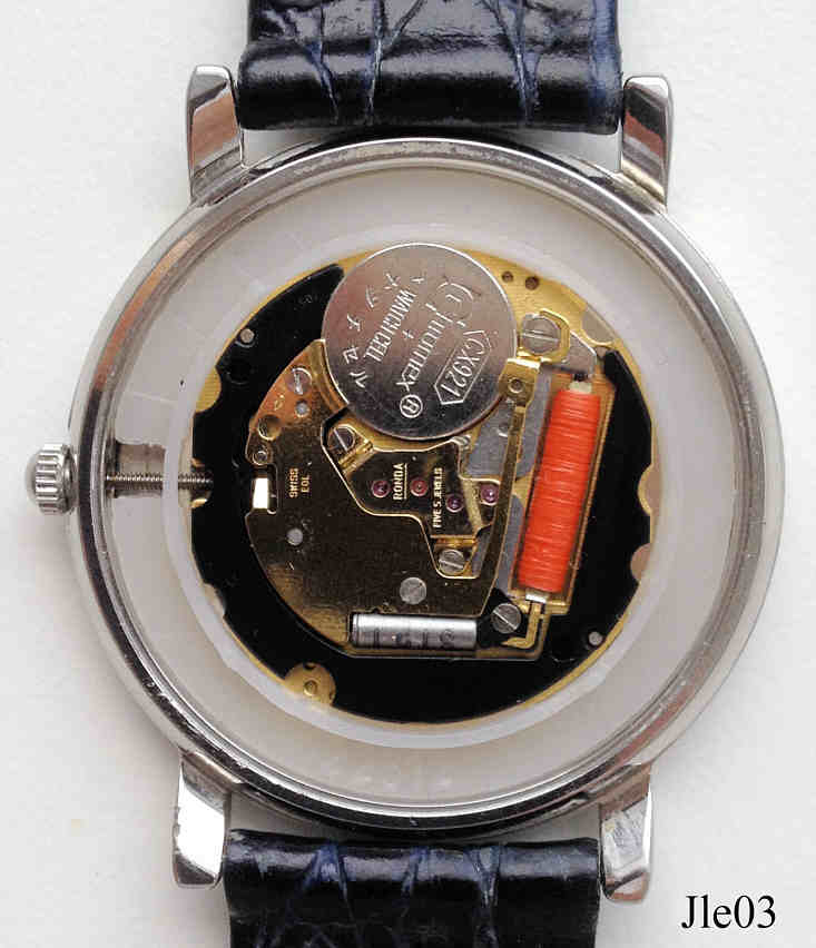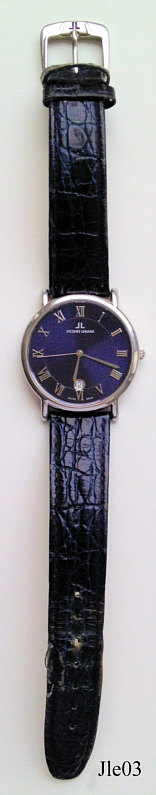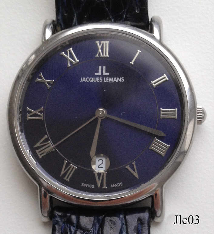 Eine Jacques Lemans Herren Quartz Uhr mit tiefblauem Zifferblatt und römischen Ziffern. Bezeichnet vorn: “JL, Jacques Lemans, Swiss Made”, hinten: “All Stainless Steel, Water Resistant 3 ATM, Sapphire Glas, JL, Jacques Lemans, Swiss Made, 1-978”, innen: “Swiss, EOL, Ronda, Five 5 Jewels”, Schwarzes Leder Armband