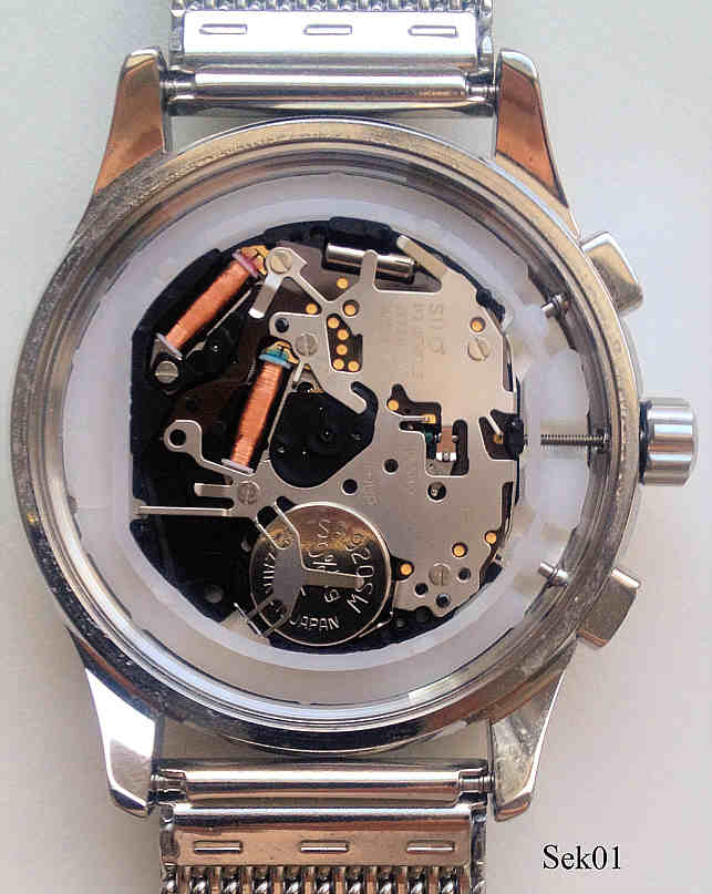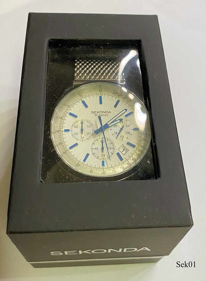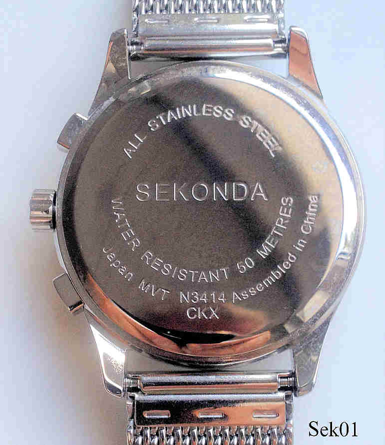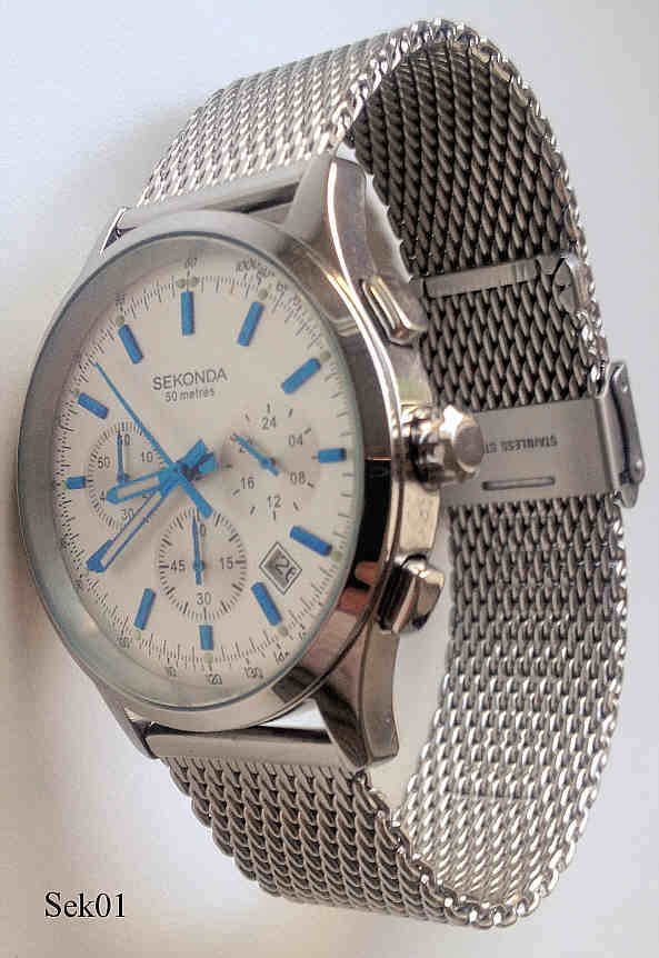 Ein Chronograph der Firma Sekonda mit Edelstahl Gehäuse und Edelstahl Meshband. Beschriftet: “Sekonda, 50 Metres”, hinten: ”All Stainless Steel, Sekonda, Water Resistant 50 Metres, Japan Mvt, N3414, Assembled in China, CKX”, innen: ”SIIO, No Jewels, Japan, ”. Das Werk ist ein SIIO Kaliber VD53B. Gewölbtes Glas, Datum bei der 4. Gekauft auf dem Rückflug von Dublin.