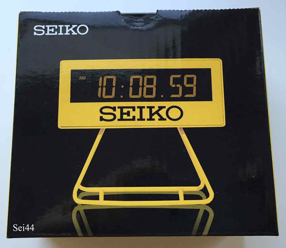 Ein digitaler Reisewecker von Seiko in gelbem Plastik Gehäuse. Diese Uhr war Bestandteil des VIP Geschenk Sets zur Eröffnung der Seiko Boutique in Frankfurt im Juli 2015. Dazu gehörte ein Grand Seiko Prospekt, ein Kugelschreiber, ein radierbarer Kugelschreiber und ein Photoprospekt, siehe Abbildung. Beschriftet vorn: “Seiko”, hinten: “Seiko Boutique, Eröffnung Juli 2015”.