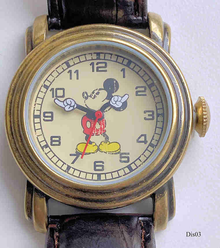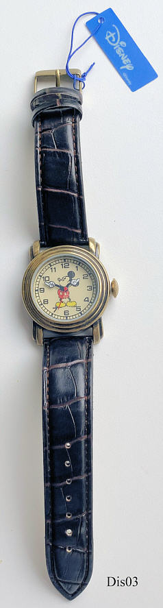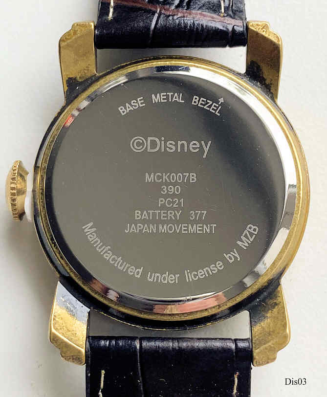 Eine Walt Disney Uhr für Jungen im Mickey Design. Es handelt sich um die Armbanduhr aus dem Disney Character Geschenk Set. Bezeichnet vorn: “ “, hinten: “Base Metal Bezel, c Disney, MCK007B, 390, PC21, Battery 377, Japan Movement, Manufacturedunder License by MZB”, innen: “No Jewels, Japan, SIIO, PC21J, Unadjusted”. Braunes Leder Armband
