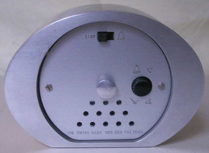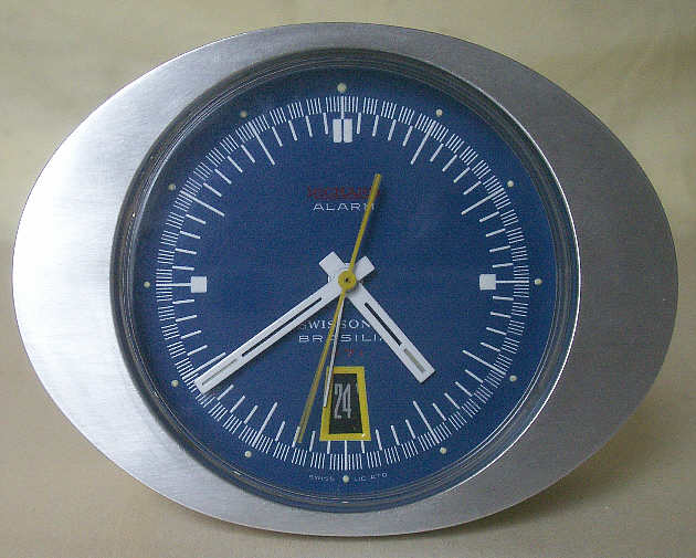Eine Richard Alarm Schreibtischuhr in einem ovalen Aluminium Gehäuse. Caliber ETA 9123, ein Werk auf dem ATO  Prinzip. Beschriftet vor “Richard, Alarm, Swissonic, Brasilia, 671”,  hinten: “170, Swiss Made, RSO. DES. PAT. PEND”€¯, Blaues Zifferblatt,  Datum bei der “6”.