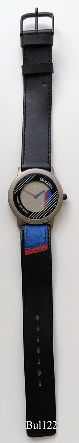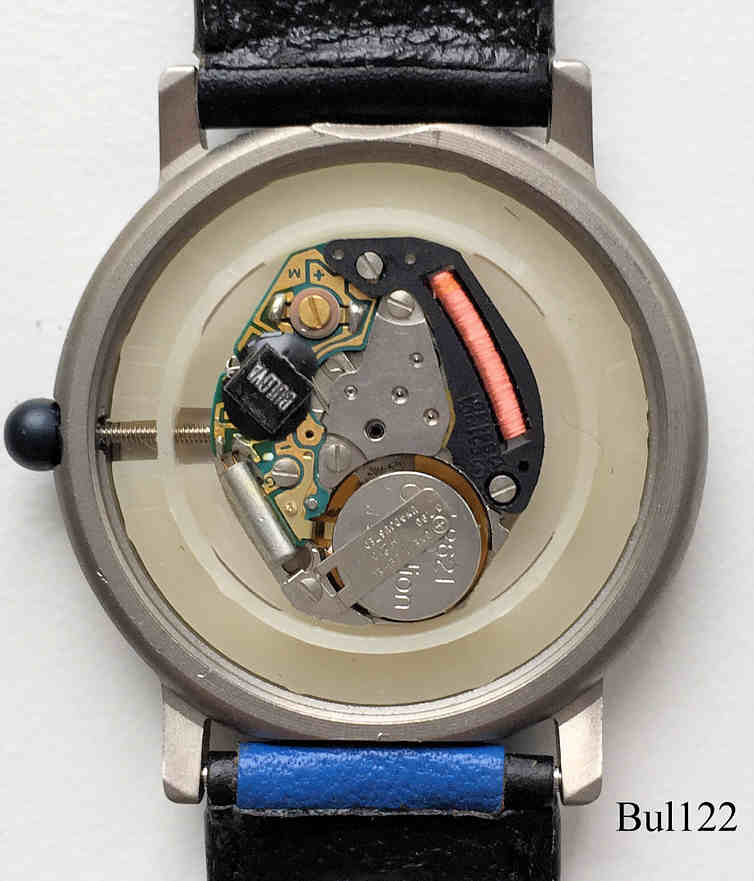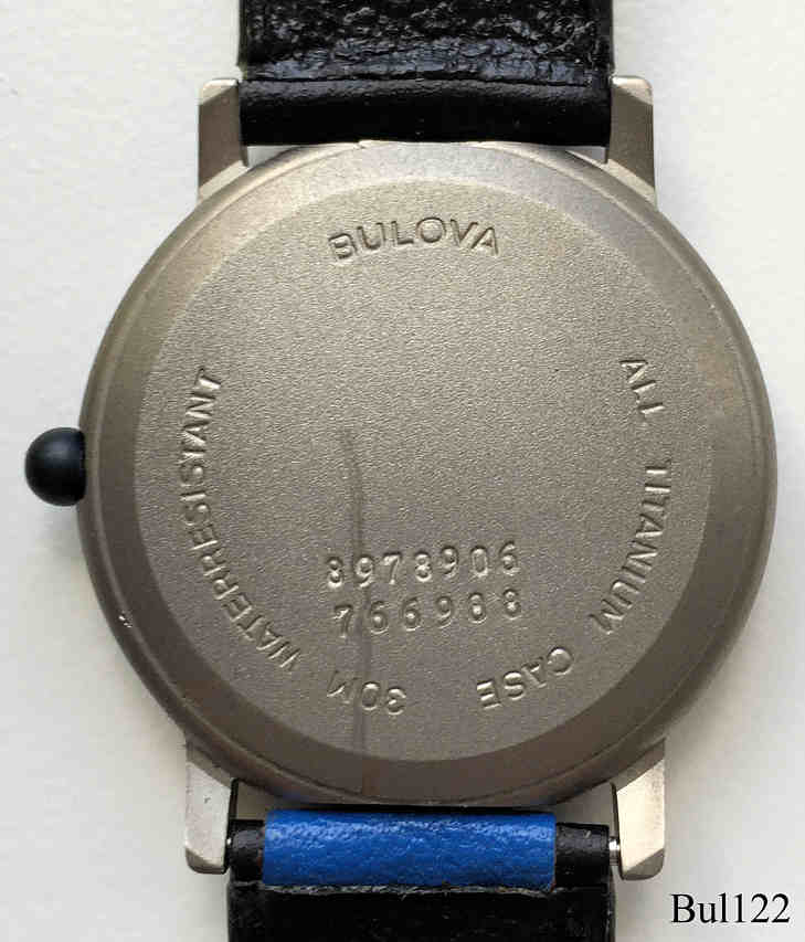 Eine recht moderne Damen Designuhr von Bulova , beschriftet vorn: “BULOVA, Water 30M Resist, Titanium”, hinten: ”30M Waterresistant, All Titanium Case, 3978906, 766988”, innen: “BULOVA, 561.001”, kein Herstelldatum, Lederarmband im Zifferblatt Design. Werk Kaliber ETA 561.001