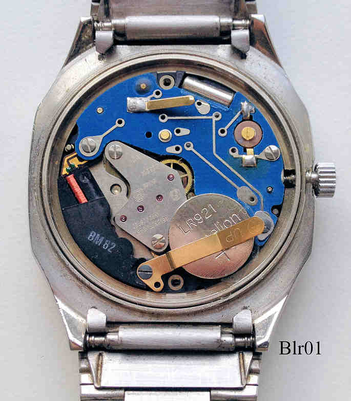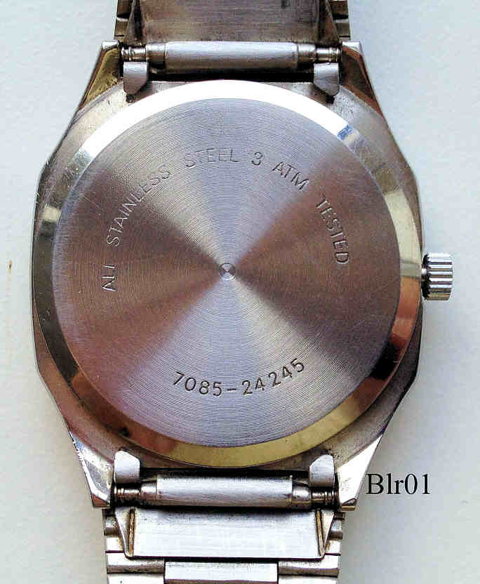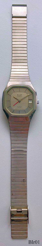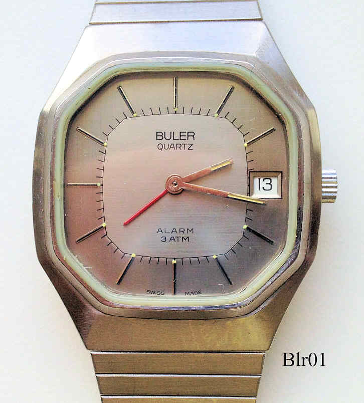 Ein Armbandwecker der Firma Buler. Der rote Zeiger zeigt die Weckzeit und wird über die Krone eingestellt. Beschriftet vorn: ”Buler, Quartz, Alarm, 3 ATM”, hinten: ”All Stainless Steel, 3 ATM Tested, 7085-24245, innen: “Seven (7) Jewels, Unadjuswed, ESA, Swiss, 926611”. Kaliber ESA 926.611. Edelstahl Gehäuse mit Edelstahl Armband.