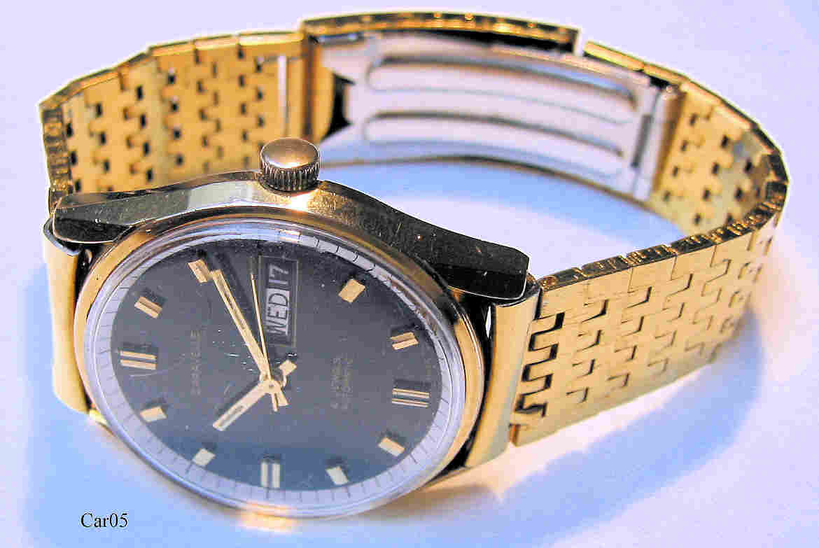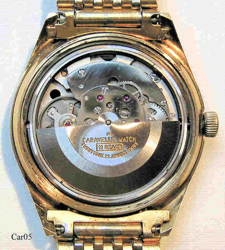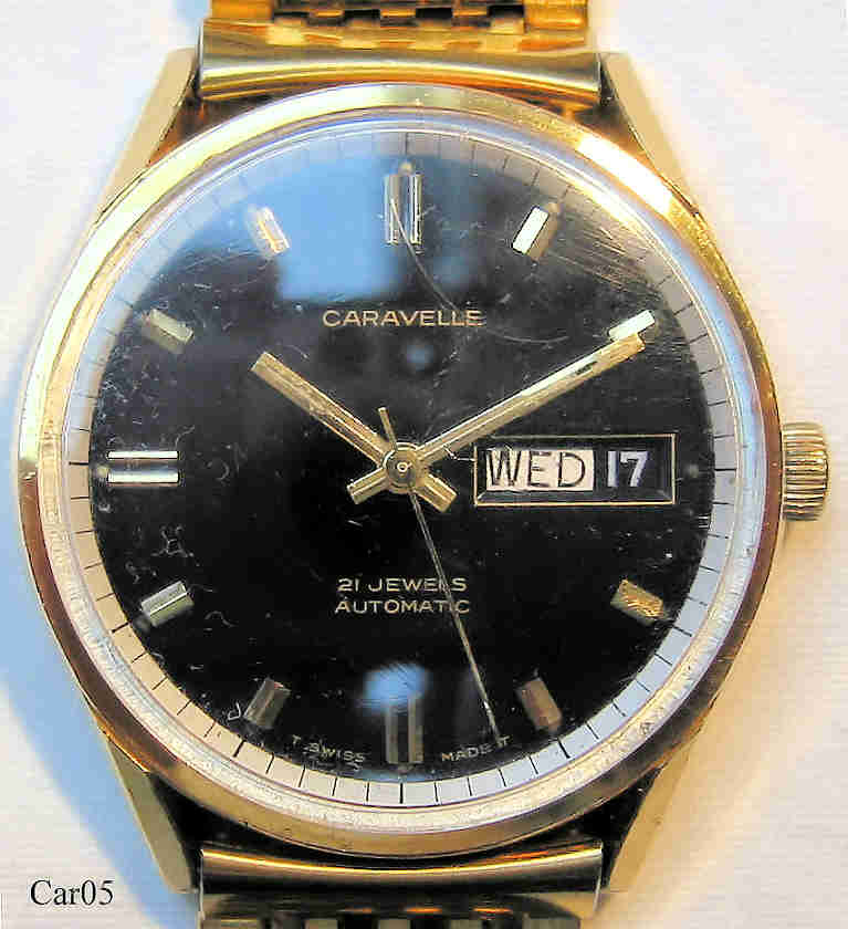 A Caravelle Automatic watch of Bulova in goldplated case (20 micron), 21 Jewels, Signed front: ”CARAVELLE, 21 Jewels, Automatic”, Inside: ”M7, Caravelle Watch, 11OZACB, Twentyone 21 Jewels Swiss”, back: ”CARAVELLE, Stainless Steel Back, Waterproof-Antimagnetic-Automatic, Shock Resistant”, Caliber 11OZACB, date of production 1967 (M7). Date and day at 3.