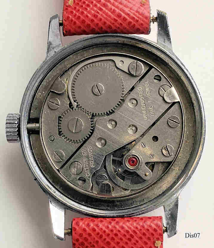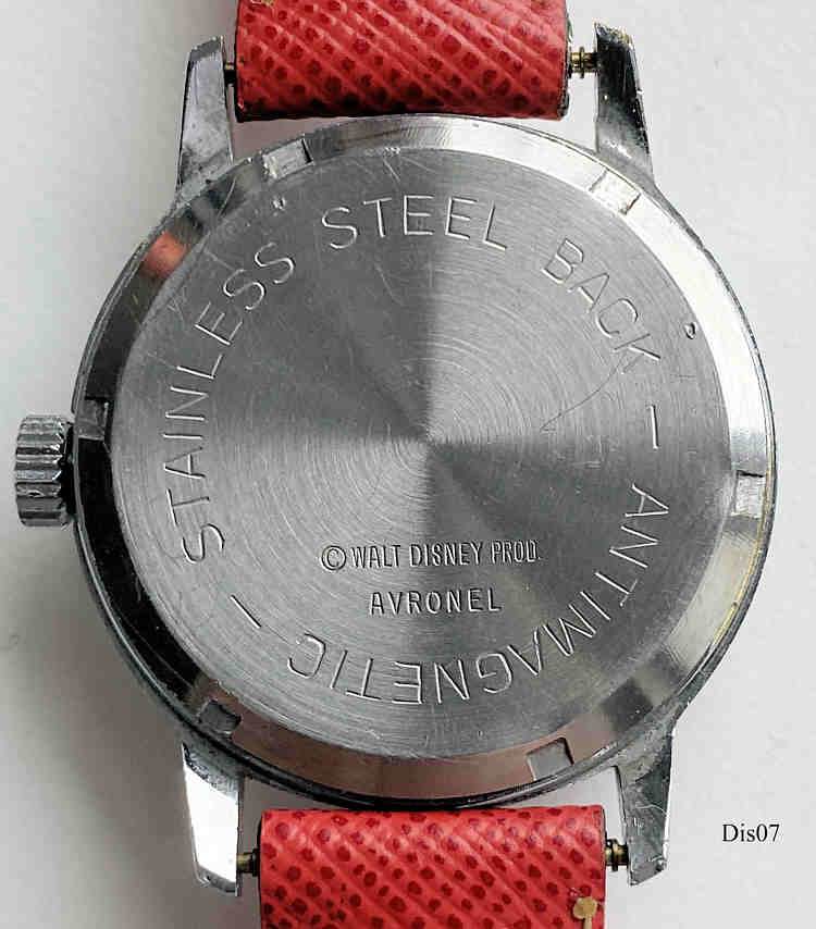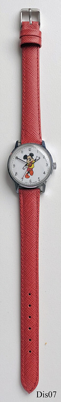 Eine Walt Disney Unisex Uhr im Mickey Design. Diese Uhr wurde in Frankreich (für Disneyland Paris?) hergestellt. Beschriftet vorn: “Made in France”, hinten: “Stainless Steel Back, Antimagnetic, c. Walt Disney Product, Avronel”, innen: “Cattin Co., France, Unadjusted, 1 Jewel”, Kaliber Cattin C66