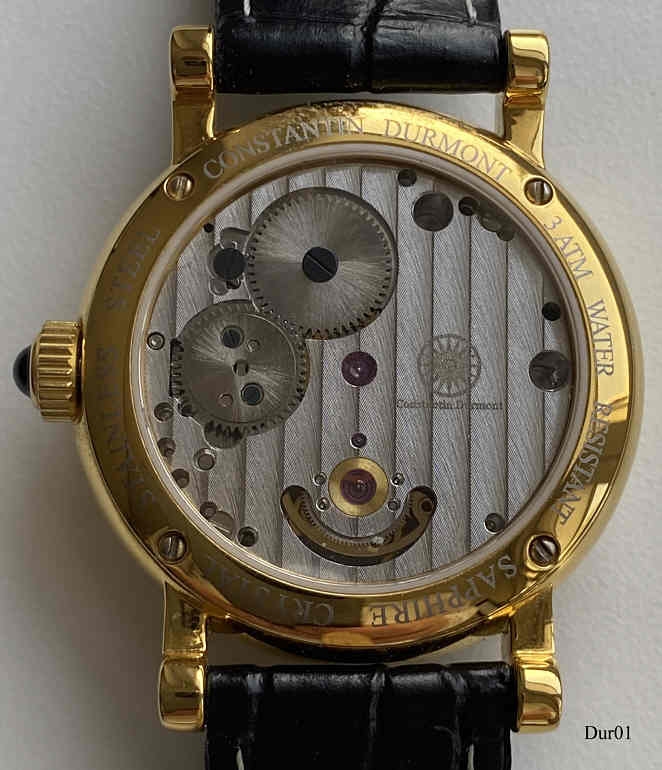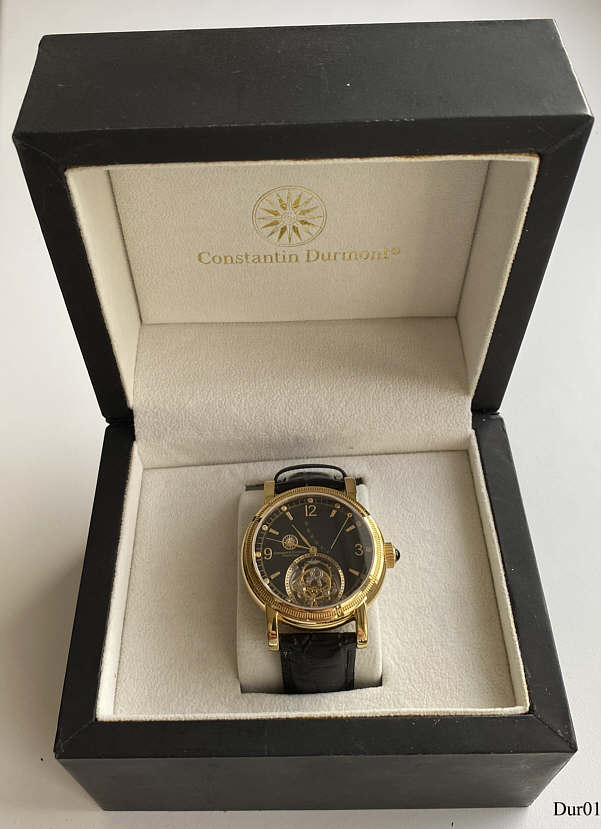 Eine Handaufzugsuhr mit “Flying Minute Tourbillon” der Marke Constantin Durmont mit China Werk Cal. 5051 der Liaoning Factory. Schwarzes Zifferblatt mit Power Reserve Anzeige. Das Tourbillon ist eine Erfindung von Abraham Louis Breguet, als Flying Minute Tourbillon verfeinert vom Uhrmacher-Lehrer Alfred Helwig. Vergoldetes Edelstahl Gehäuse mit verschraubtem Glasboden und schwarzem Lederarmband. Beschriftung vorn: “Constantin Durmont, Tourbillon”, hinten: “Constantin Durmont, 3 ATM Water Resistant, Saphire Chrystal, Stainless Steel”, innen: “Constantin Durmont, Logo”.