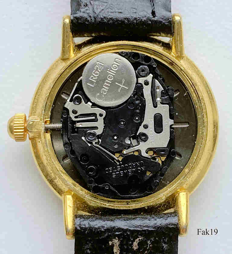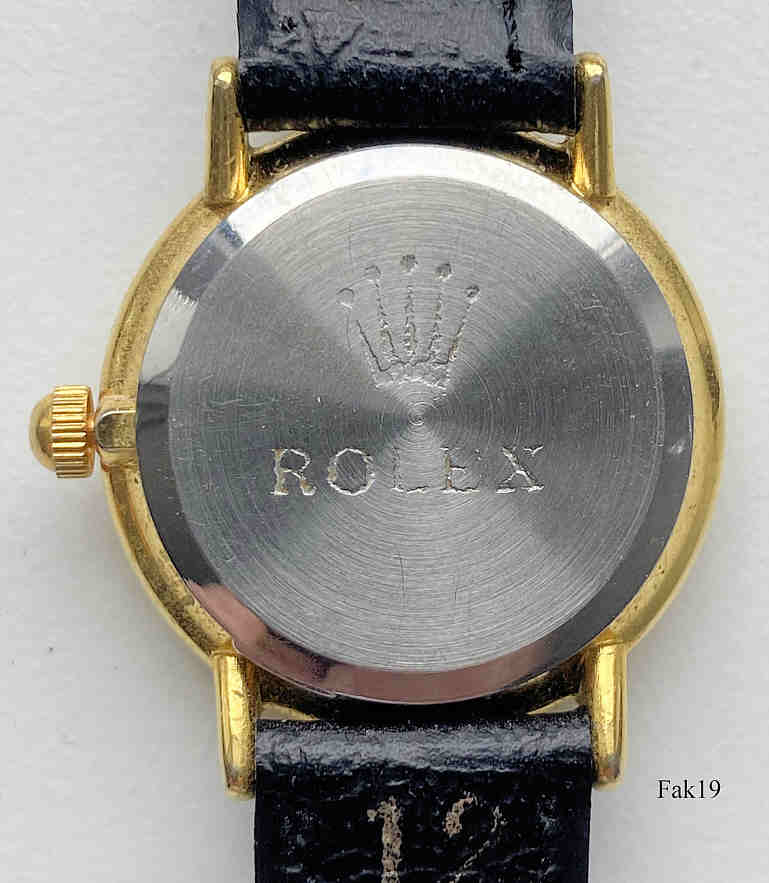 Dies ist ein Rolex Cellini Nachbau, vermutlich aus China. Ausgerüstet mit einem einfachen SIS PC21S Quartzuhrwerk. Beschriftet vorn: ”Rolex, Geneve, Cellini.”, innen: ”No Jewels, Unadjusted, Singapore, SIS, PC21S”, hinten: “ROLEX” , Schwarzes Lederarmband.