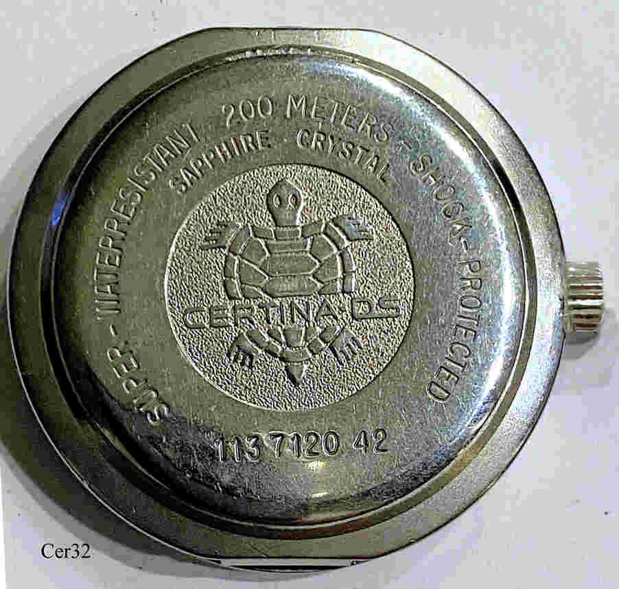 Dies ist eine Certina DS Quartz Uhr, Beschriftet vorn: ”Certina, DS, Q”, innen: ”Seven 7 Jewels, V8, 955.412”, hinten: ”Certina DS, Super Water Resistant 200 Meters, Shock Protected, Sapphire Crystal, 113 7120 42”. Gehäuse Edelstahl, geklemmter Boden, Kaliber ESA 955.412. |