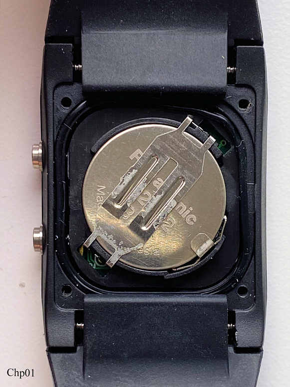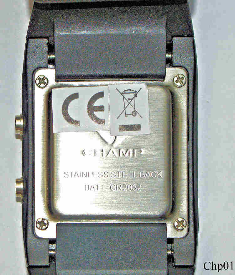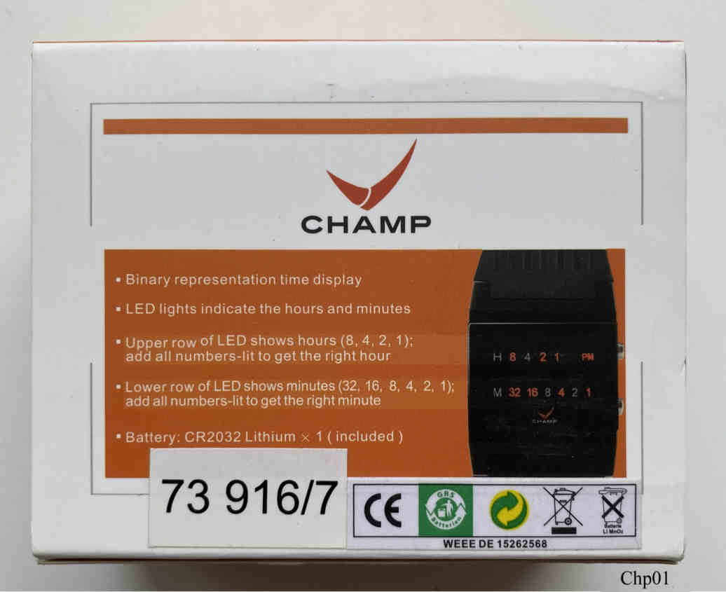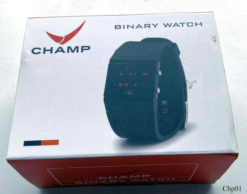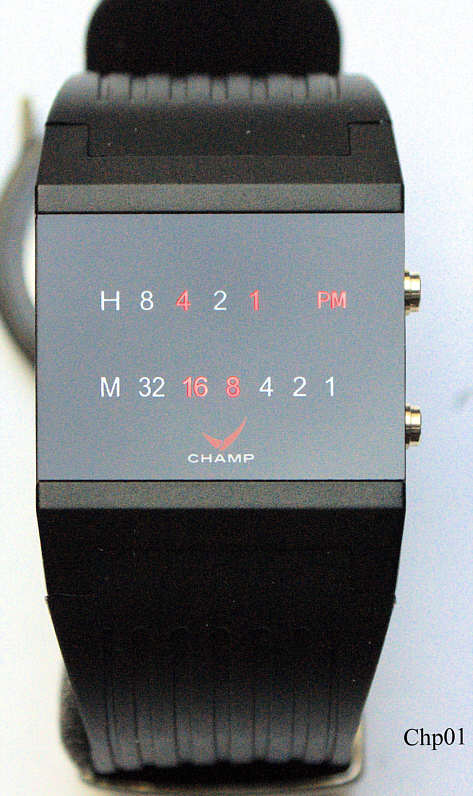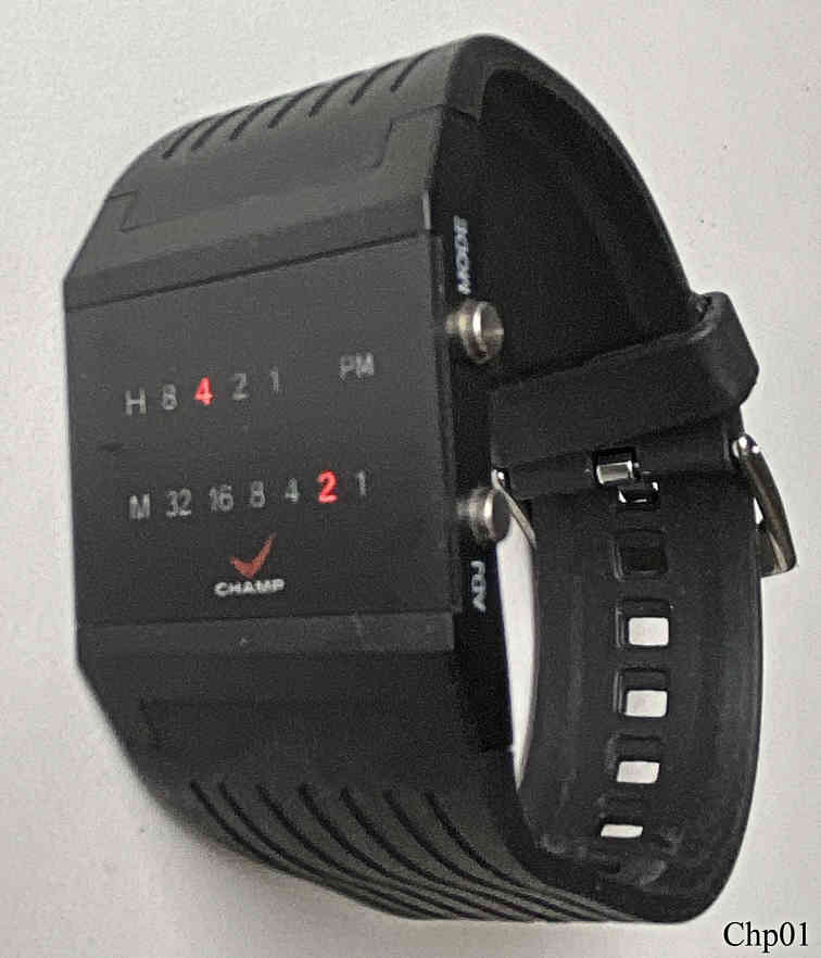 Dies ist eine Champ Binär LED Uhr aus Chinesischer Produktion. Abgelesen wird so: Stundenanzeige 4+1 = 5 Uhr, Minutenanzeige 16+8= 24 Minuten, PM=Nachmittag, also 17:24 Uhr. Um die Batterie zu schonen wird die Uhrzeit nur für 5 Sekunden angezeigt, wenn man den oberen seitlichen Knopf drückt, da die LED Anzeigen sehr viel Strom aufnehmen. Das Gehäuse ist aus Kunststoff, Rückseite Stainless Steel, mit einem Kautschuk Band