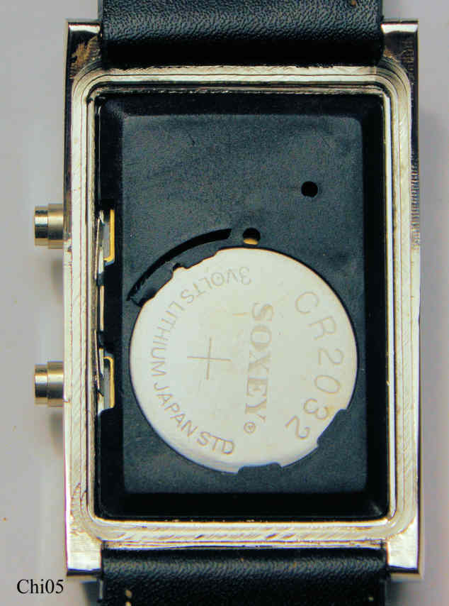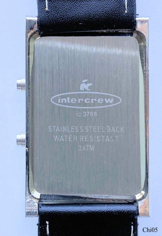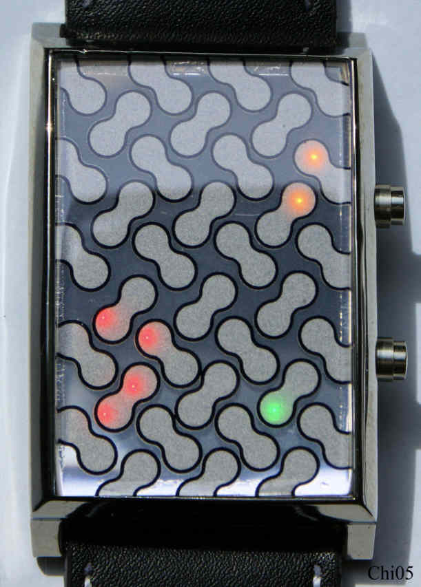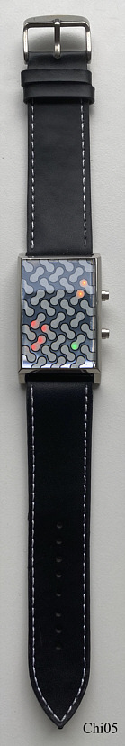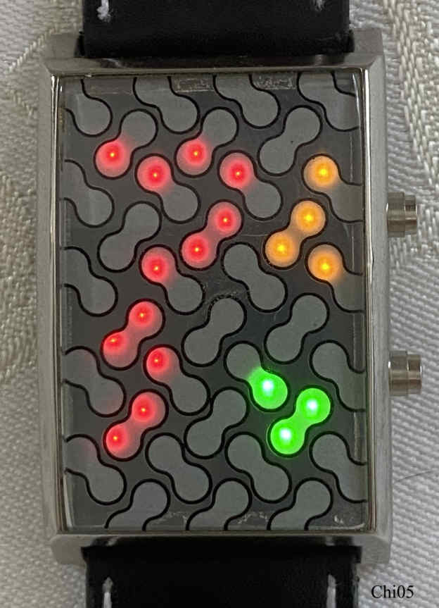 This is an extremely uncommon LED watch from China, I call it Chaos LED. Unlit it looks like a modern piece of art, lit it shows the exact time in a very uncommon way: The red LEDs show the hours, the yellow LEDs show 5 minutes, the green LEDs show the minutes. In the first example it reads: 4x red = 4:00, 2x yellow = 10 minutes, 1x green is 1 minute, so the time is 4:11, the second example shows 12 times red =12 Hours, 4 times yellow = 20 Minutes and 3 times green = 3 Minutes so it shows 12:23 Hours.. Signature on the back: “Intercrew, c3788, Stainless Steel Back, Water Resistant, 3ATM”.