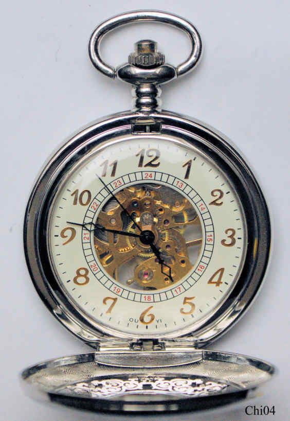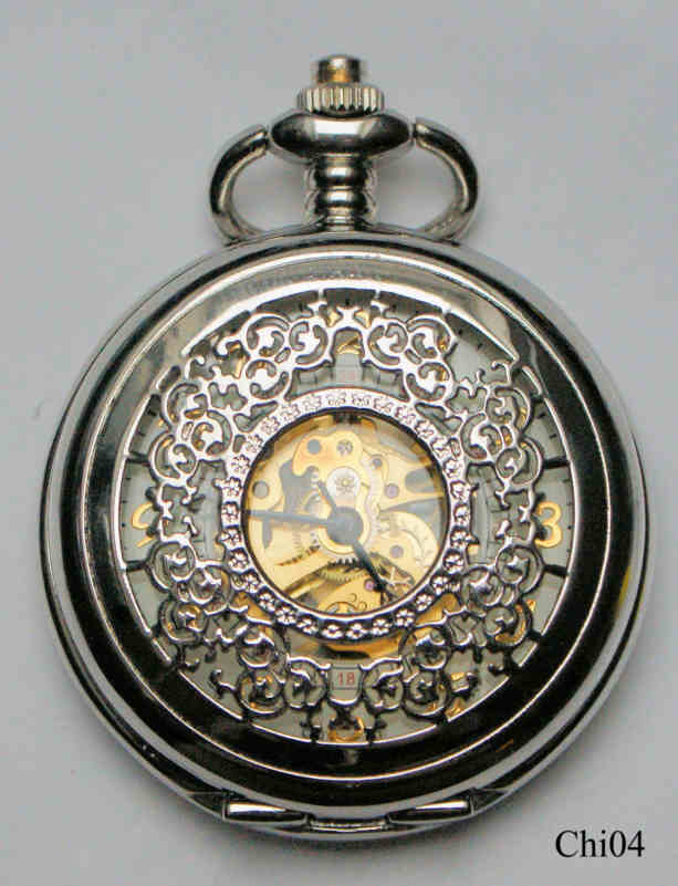 Eine moderne Chinesische Taschenuhr. Gehäuse Base Metal in Silber mit filigraner Oberfläche und Glaseinsatz. Durchbrochenes Zifferblatt mit Zentralsekunde. Deckel öffnet durch Druck auf die Krone.