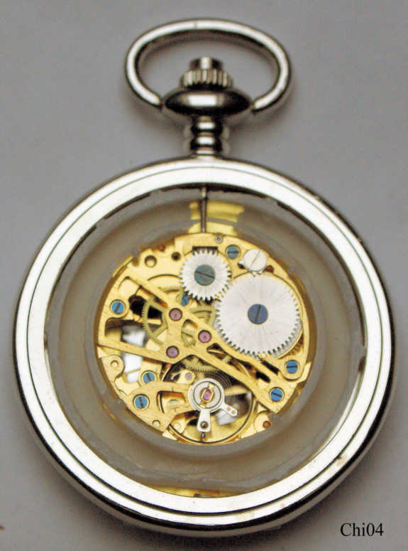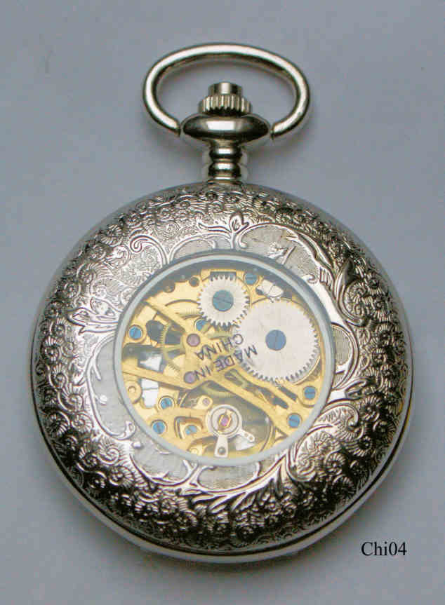 A modern handwind chinese pocket watch with silver tone base metal case and central second hand. Skelettonized movement and seethrough case. Cover opens by pressing the crown.