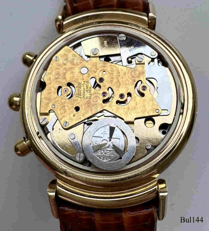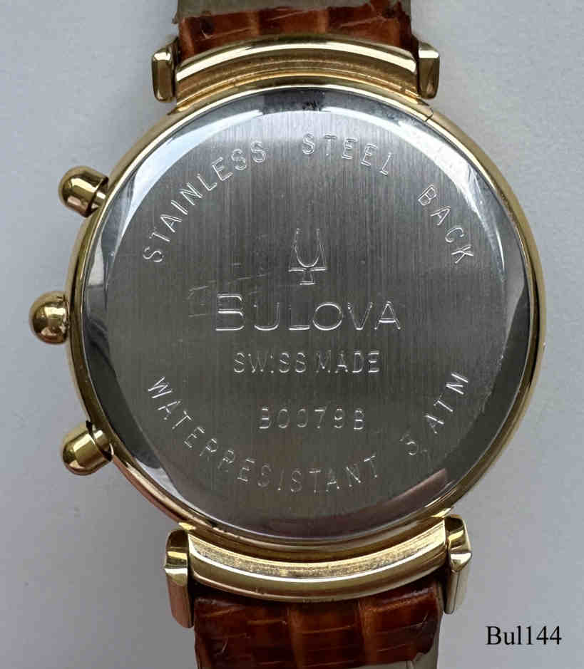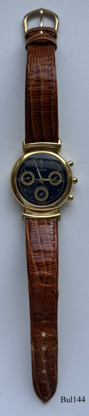 Ein Quartzchronograph von Bulova mit einem dunkelblauen Zifferblatt mit drei goldgrahmten Fenstern. Beschriftet vorn: “BULOVA, Chronographe, Swiss Made”, hinten: ”Bulova, Swiss Made, B0079B, Stainless Steel Back, Water Resistant 3 ATM”, innen : ”Harley Ronda S.A., 11 Jewels, Eleven, 726, Swiss, CBB.” Braunes Leder Armband, Kaliber Ronda 726.