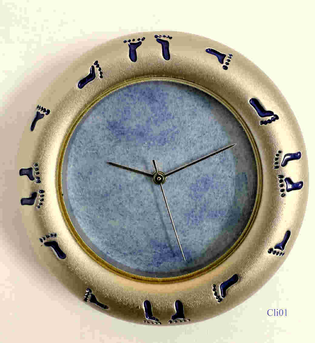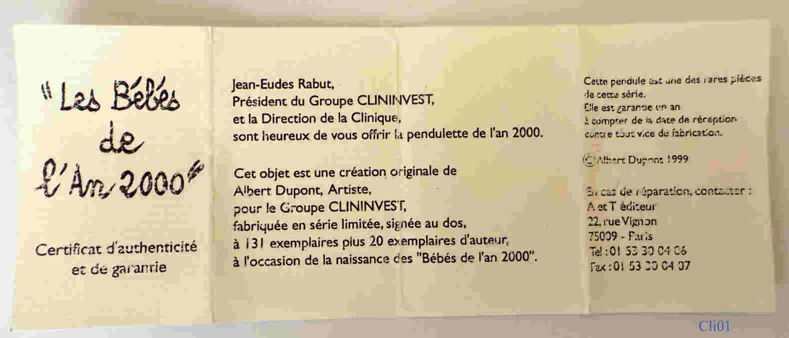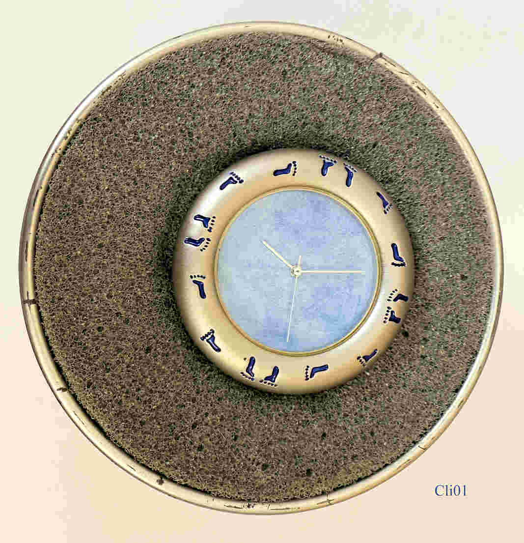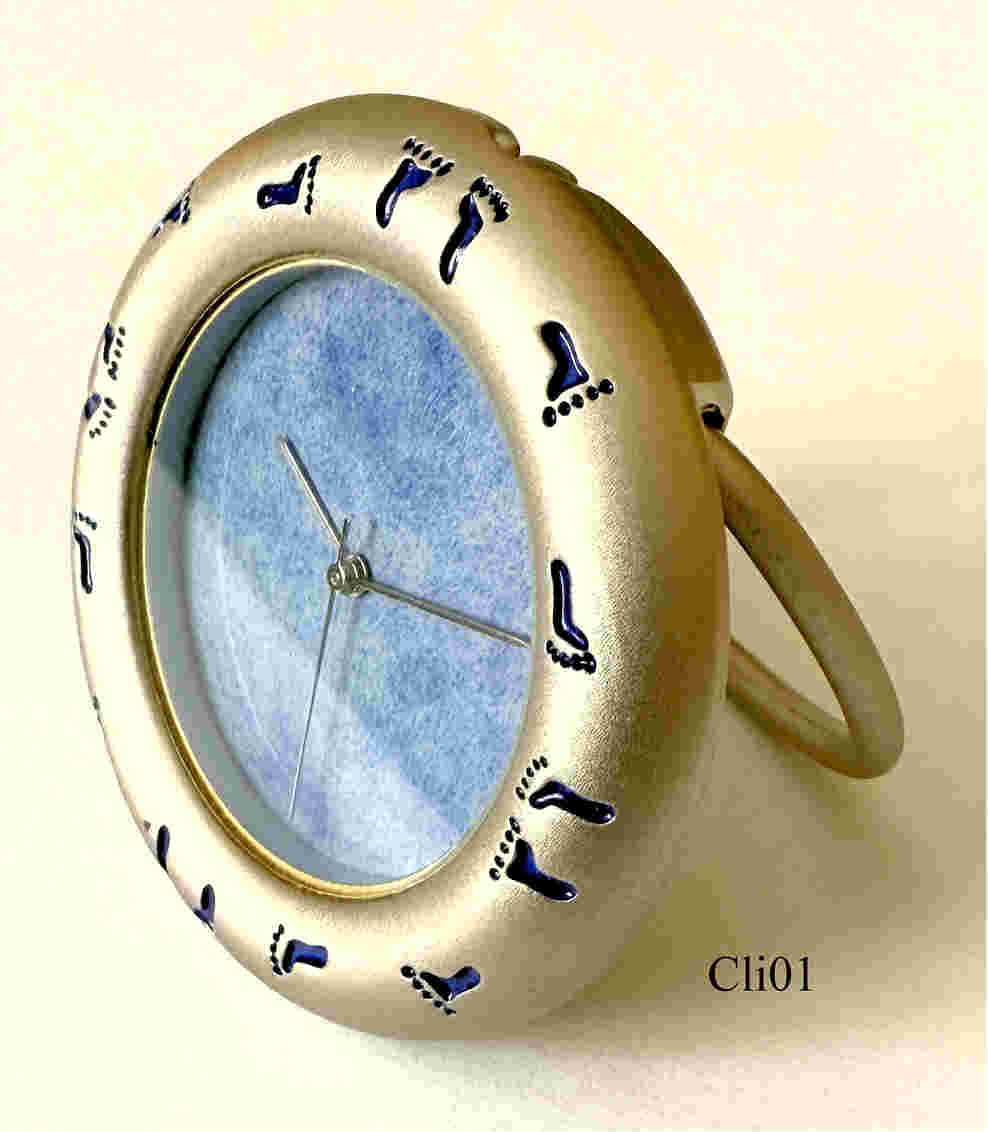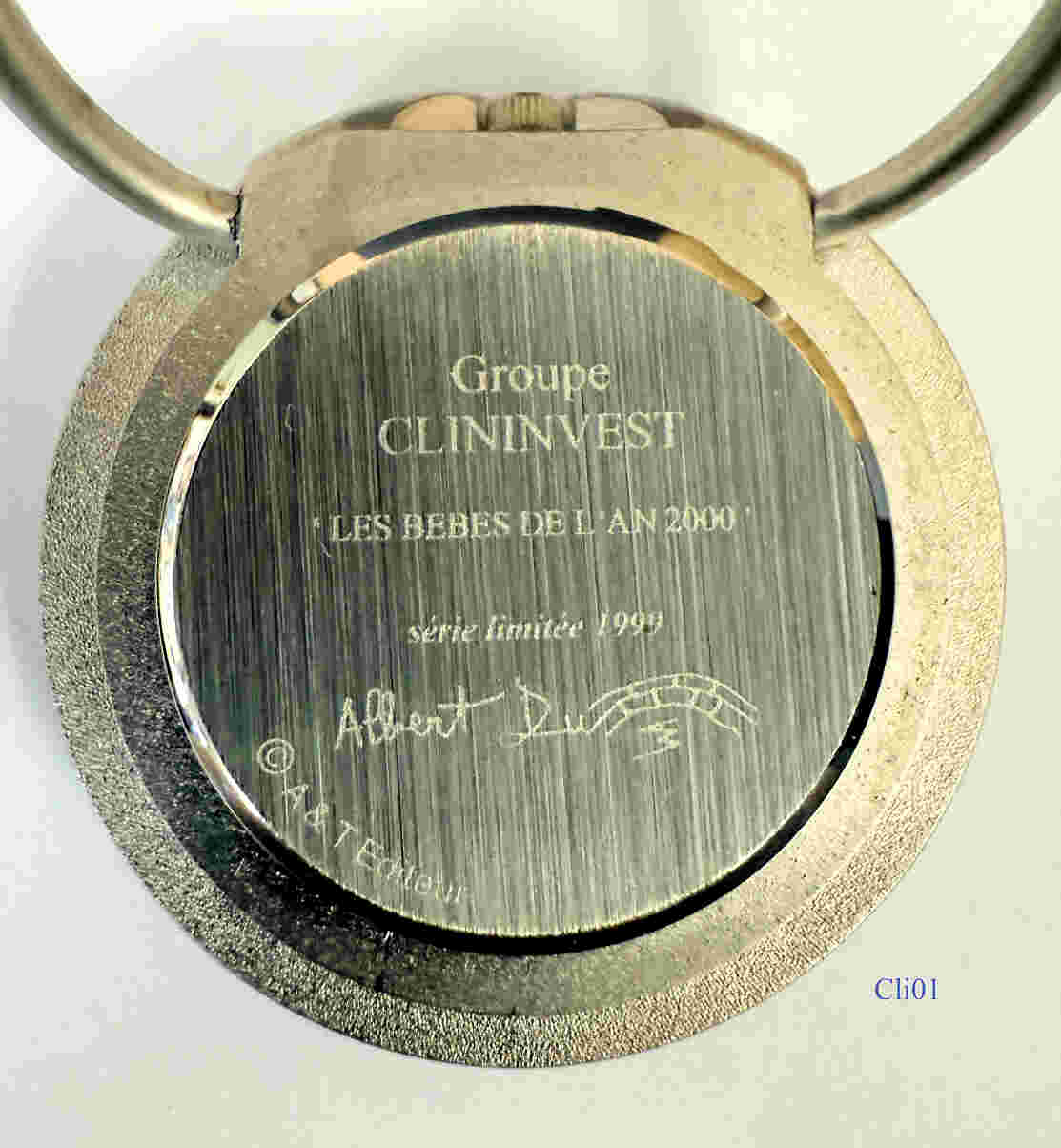 Eine Schreibtischuhr von der Firma Groupe Clininvest zur Begrüßung der Kinder des Jahres 2000. Design: Albert Dupont Ende 1999. Limitierte Serie von 131 Stück, plus 20 für den Designer. Beschriftet vorn: Kinder Fußabdrücke, hinten: “Groupe, Clininvest, “Les Bébes de L’An 2000”, Serie Limité, Logo Albert Dupont, @A&T Editeur”. Uhrwerk SIIO PC21A