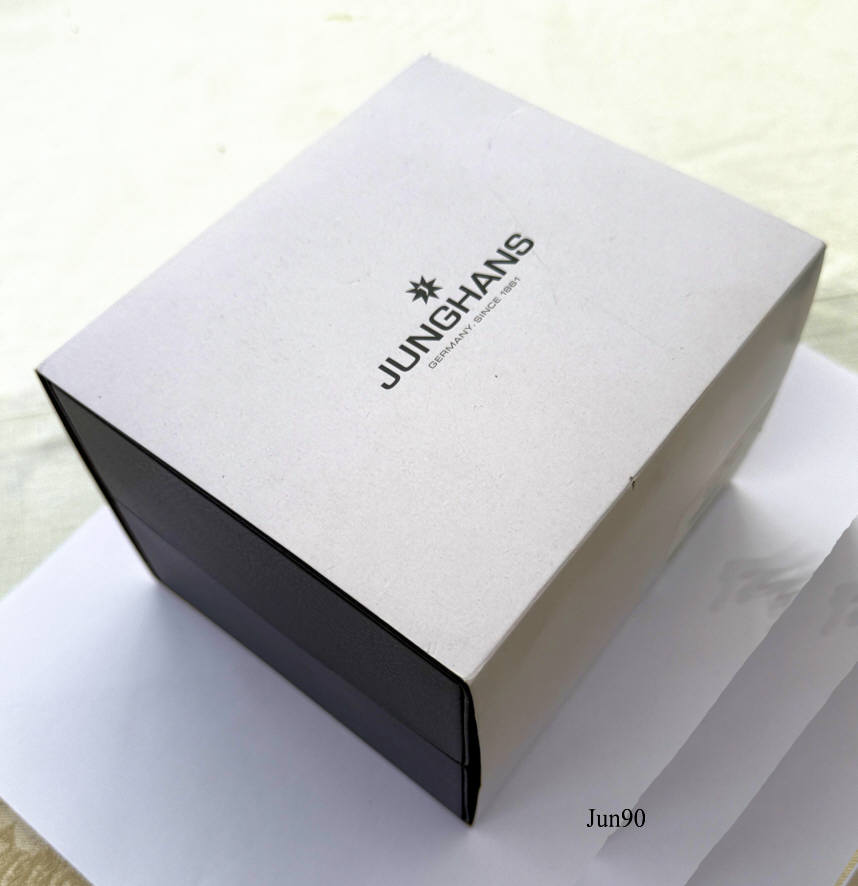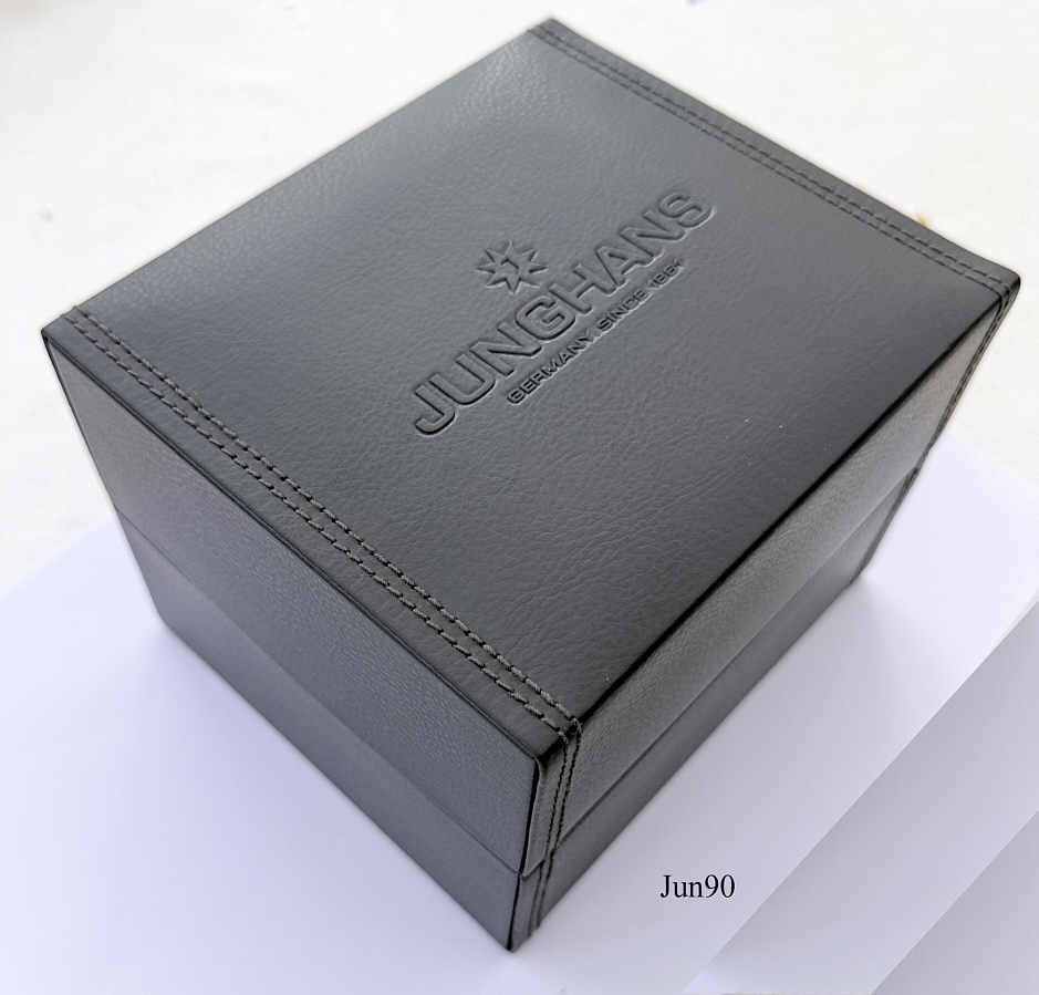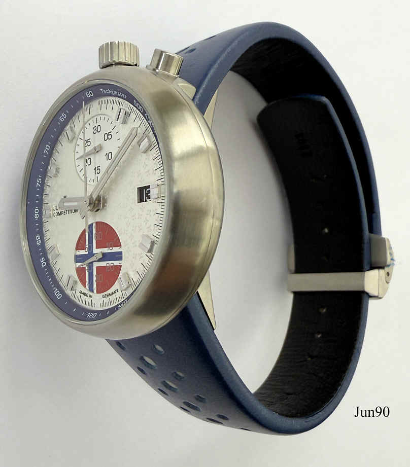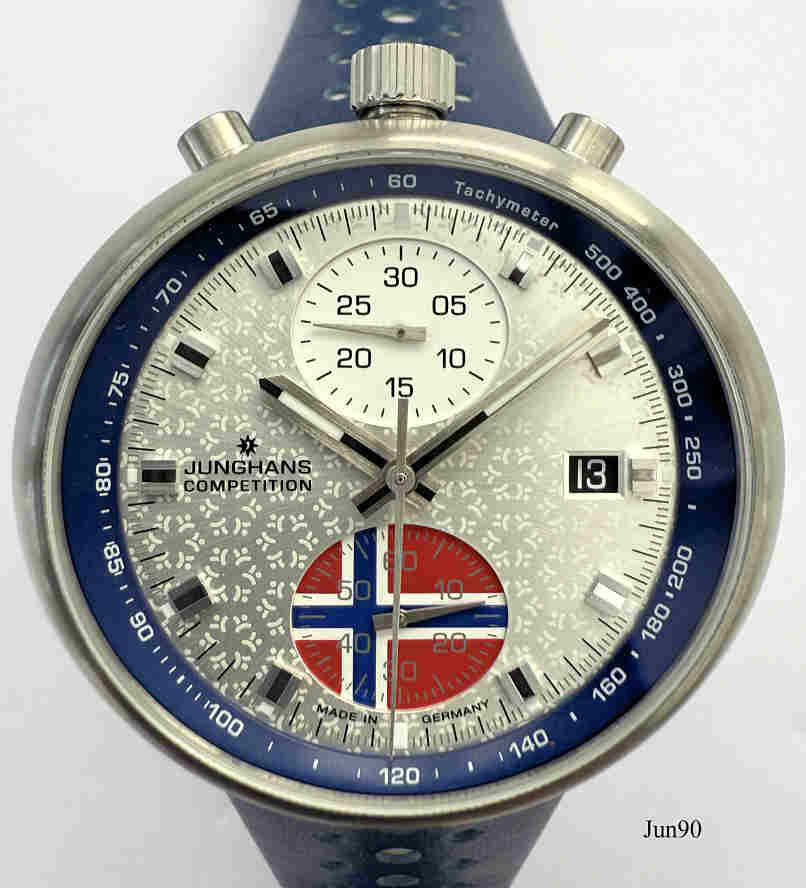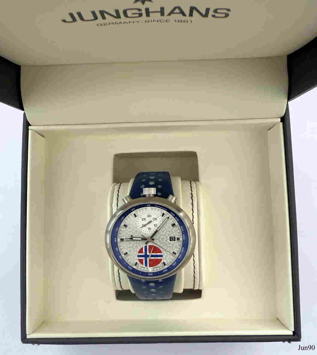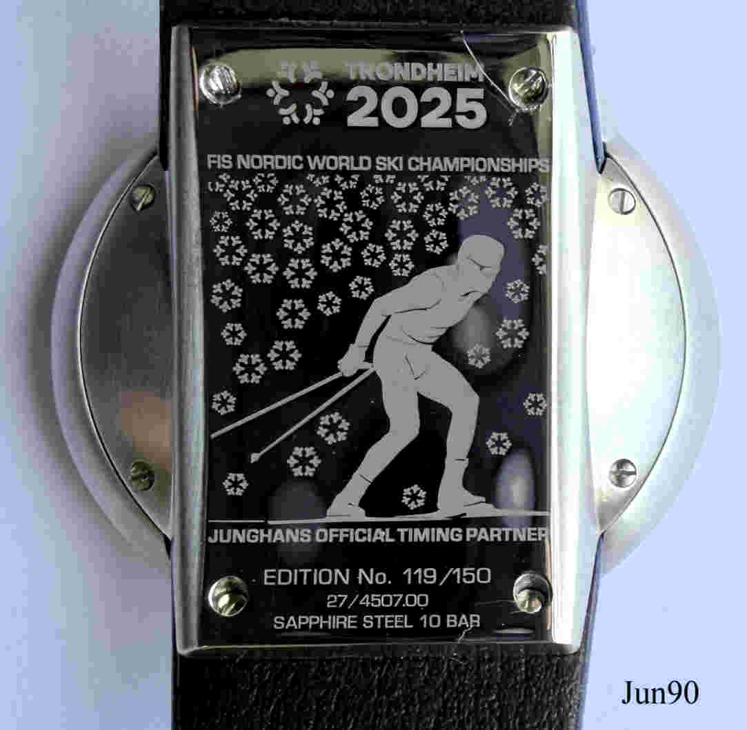 Dies ist eine Junghans Bullhead Competition Automatic Uhr im ovalen Edelstahl Gehäuse. Silbernes Zifferblatt mit schwarzem Datum bei der 3, Norwegischer Flagge bei der 6 und gelaserten Schneeflocken. Beschriftet vorn: ”€¯Junghans Competition, Made in Germany”, hinten: ”Trondheim 2025, €¯Junghans Official Timing Partner, Edition No.: 119/150, Sapphire Steel 10 Bar”innen: ”Junghans, 27 Jewels, Twentyseven, Swiss”€¯. Kaliber J880.5, Blaues Leder Armband mit spezial Schließe.