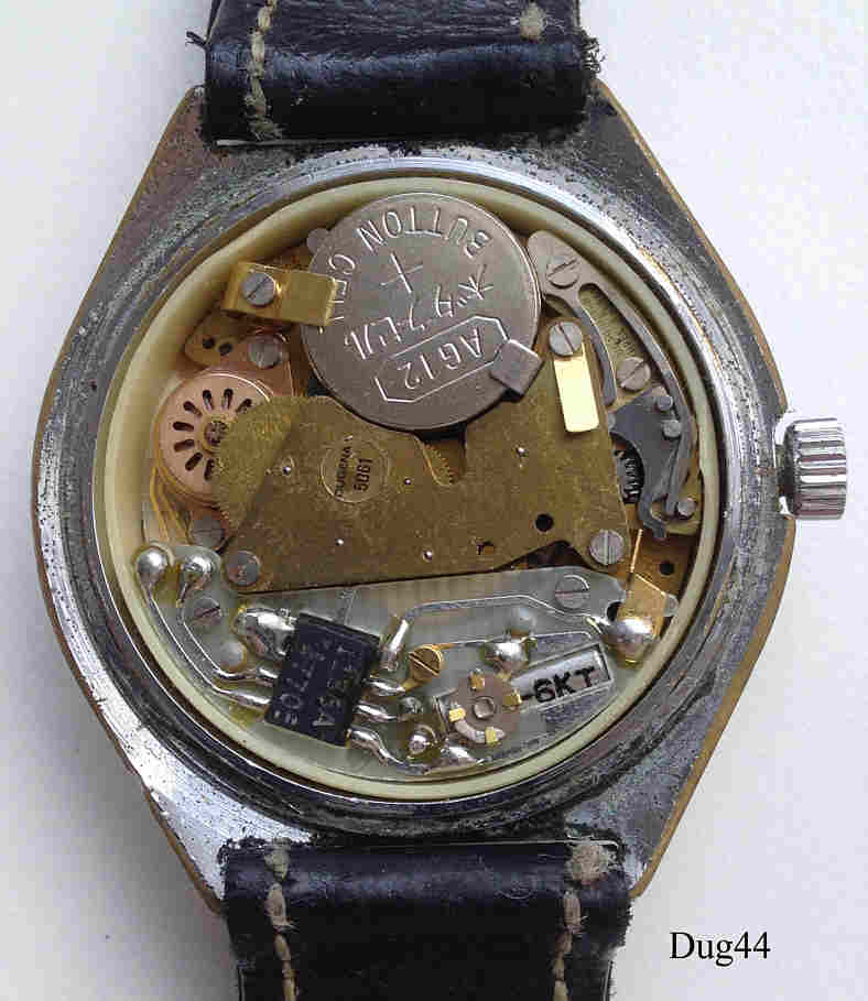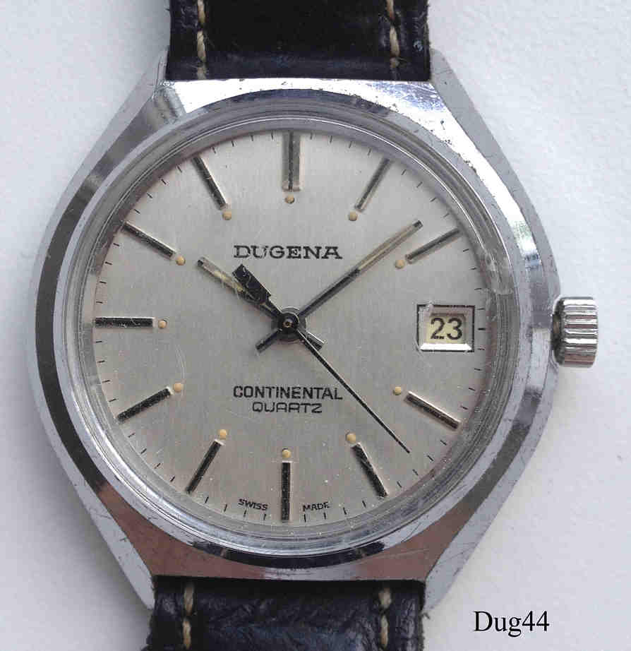 Eine frühe Dugena Herren Quartzuhr mit Base Metal Gehäuse und Stainless Steel Back, Kalender bei der 3. Kaliber Dugena 5061, entspricht dem SSiH 5500. Beschriftung vorn: “Dugena, Continental, Quartz”, hinten: ”Water Resistant, Edelstahlboden, 891202, 115”, innen: ”Dugena 5061, Unadjusted, Three 3 Jewels, SSiH 5500, Swiss, 706A”. Schwarzes Lederarmband mit neutraler Schließe.