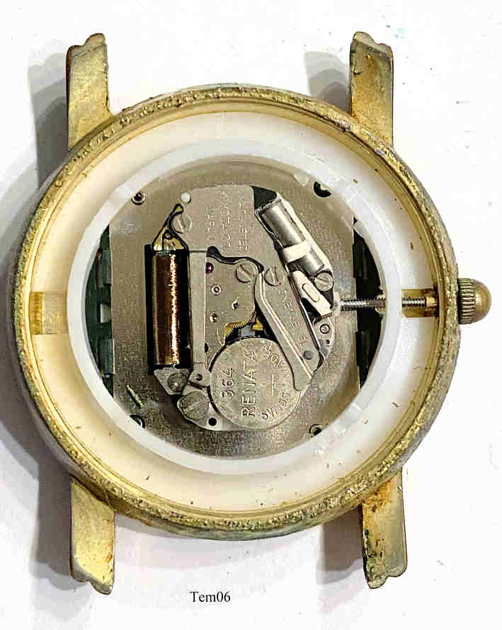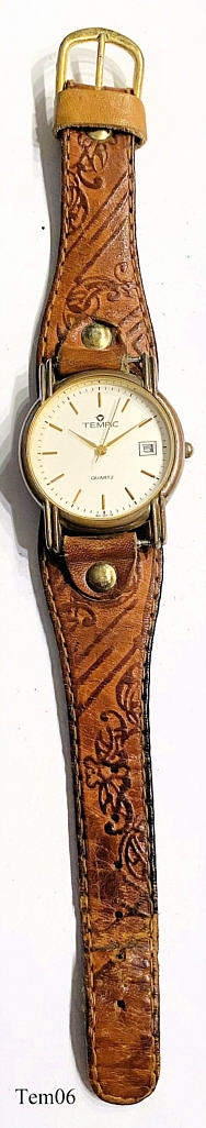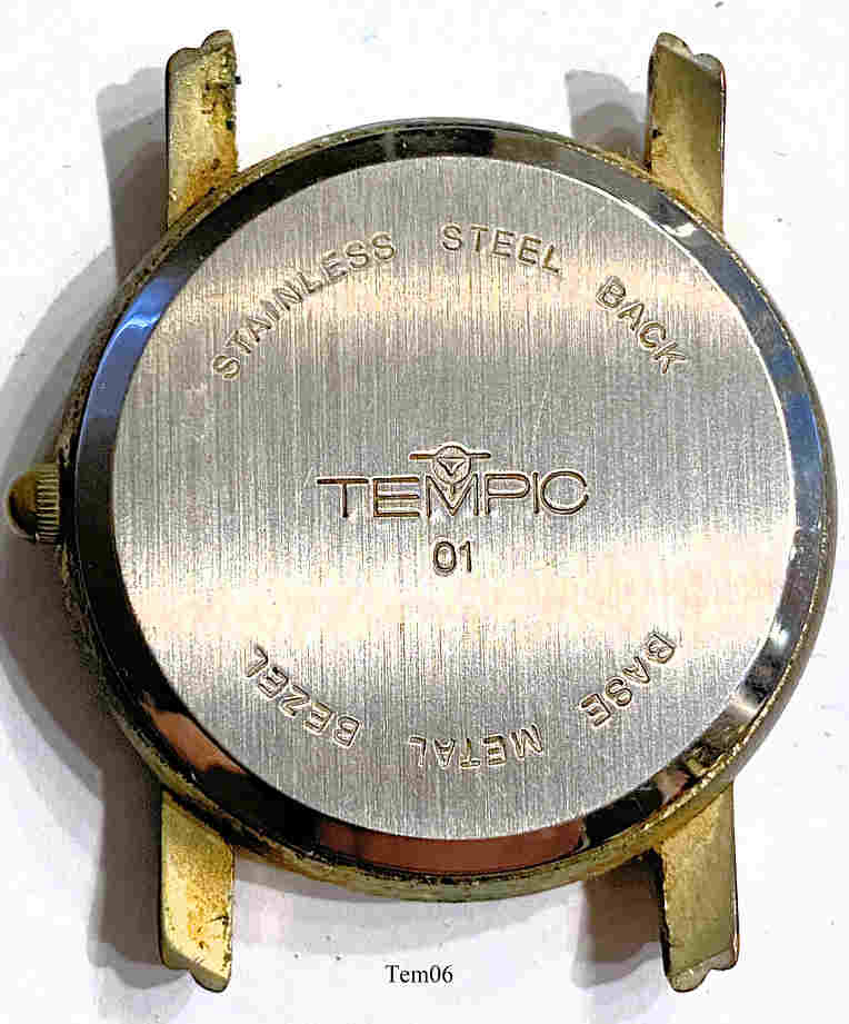 This is a ladies watch from Tempic in country designl. Signed front: “Tempic, Quartz”, back: ”Base Metal Bezel, Stainless Steel Back, Tempic, 01”, inside: ”Unadjusted, Miyota Co., Japan, One 1 Jewels””