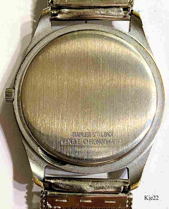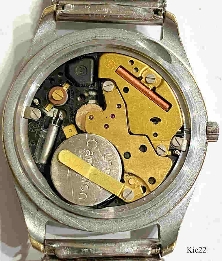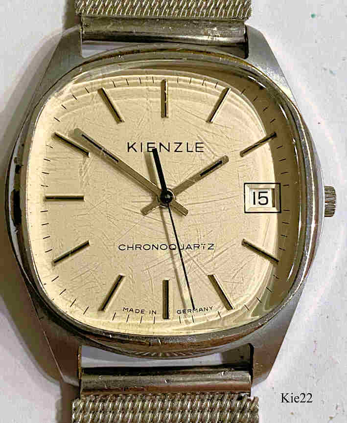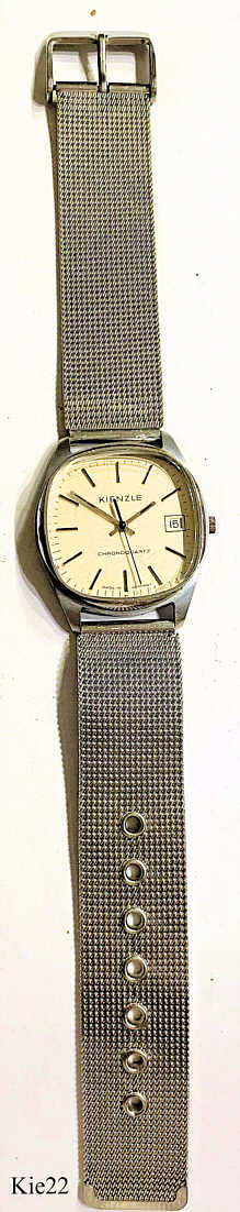 Dies ist eine Kienzle Chronoquartz Uhr mit dem ESA 944.111 Werk, Datum bei der 3. Beschriftet: ”Kienzle, Chronoquartz, Made in Germany”, Rückseite: ”Kienzle Chronoquartz, Stainless Steel Back”, innen: “Seven 7 Jewels, Unadjusted, Swiss, ETA 944.111”. Gehäuse Base Metal, Milanaisearmband. Caliber ESA 944.111,