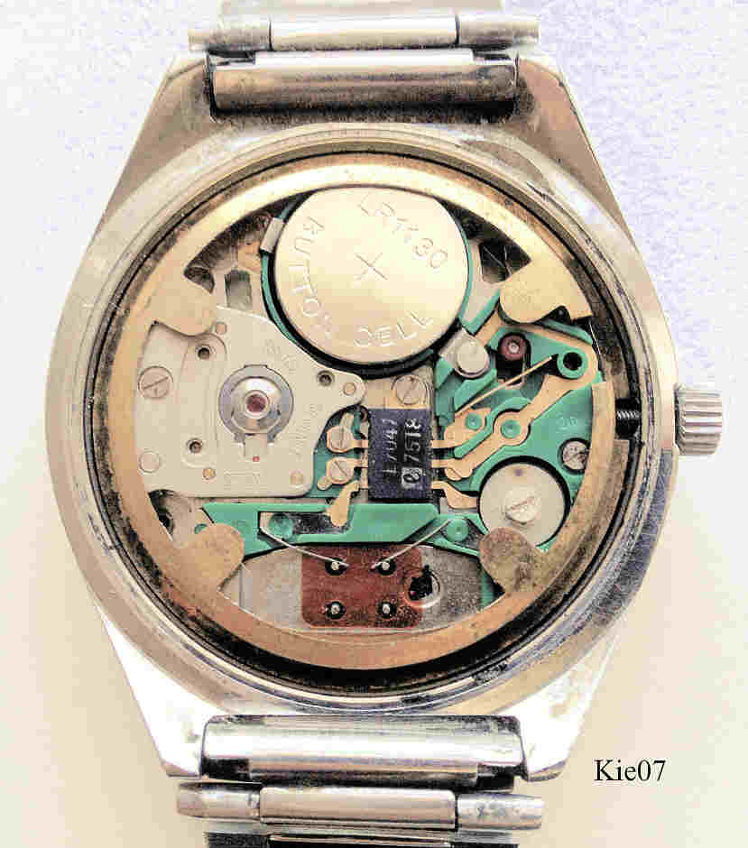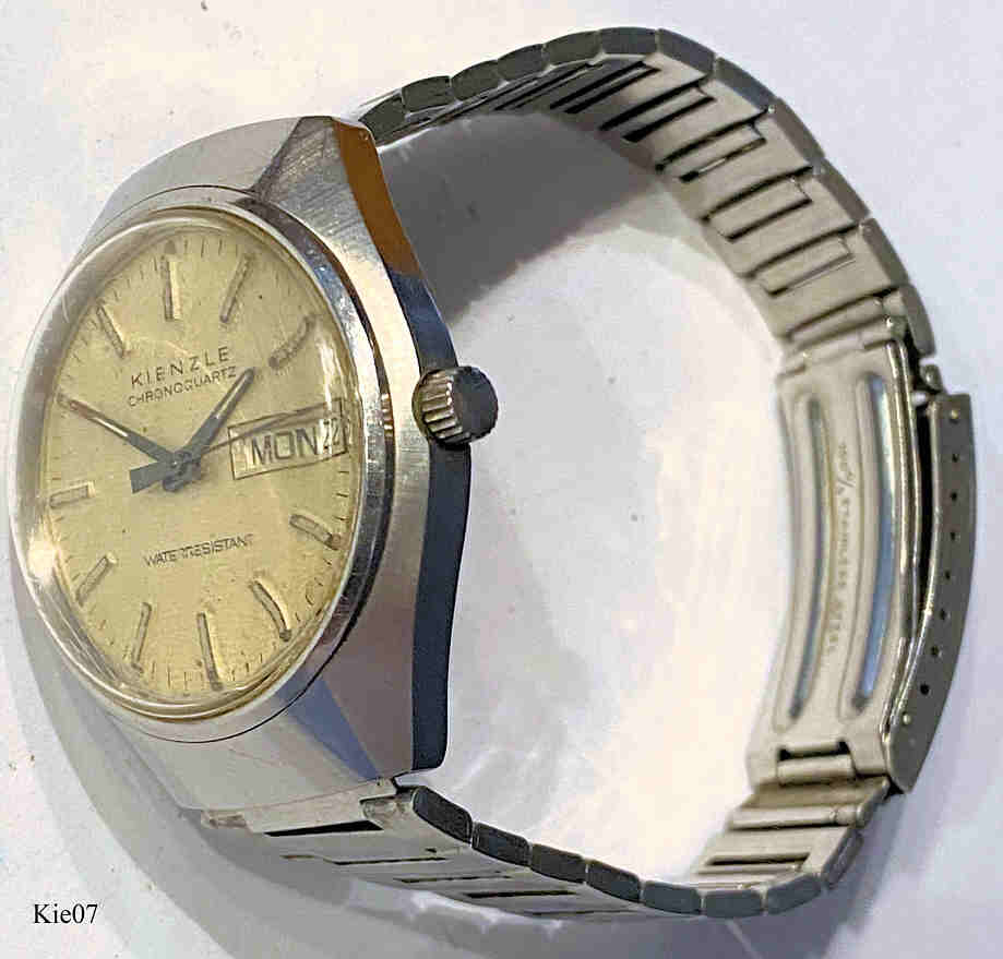 Dies ist eine Kienzle Chronoquartz Uhr mit dem ESA 9181 Werk. Beschriftet: ”Kienzle, Chronoquartz, Water Resistant”, hinten: ”Kienzle, Chronoquartz, All Stainless Steel”, innen: “ETA 9181, Seven 7 Jewels, Swiss”. Gehäuse Edelstahl, Edelstahl Armband. Caliber ESA 9181,