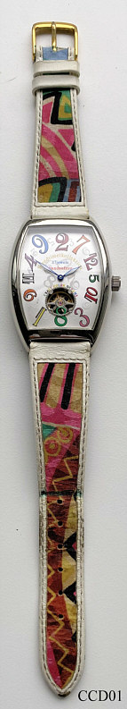 Eine sehr eigenwillige Handaufzugsuhr mit springendem Stundenzeiger, Edition Speedtimer Collection. Das Besondere an dieser Uhr ist der springende Stundenzeiger, der immer um 5 Stunden weiterspringt. Damit sind die Ziffern sehr chaotisch angeordnet, was natürlich den besonderen Reiz dieser Uhr ausmacht. Beschriftung vorn: “Speedtimer Collection, 17 Jewels, Handaufzug, Crazy Color Dreams”, innen: “ ”, hinten: “SpeedtimerKollektion, color design, 17 jewels, Handaufzug power”. Weißes bedrucktes Lederarmband