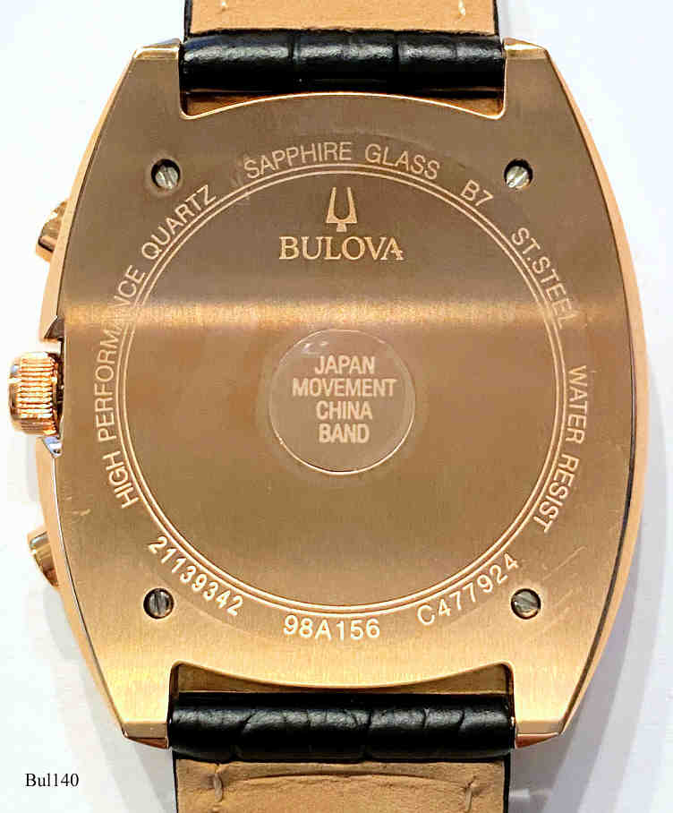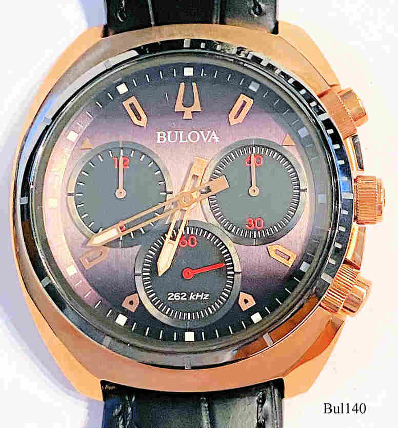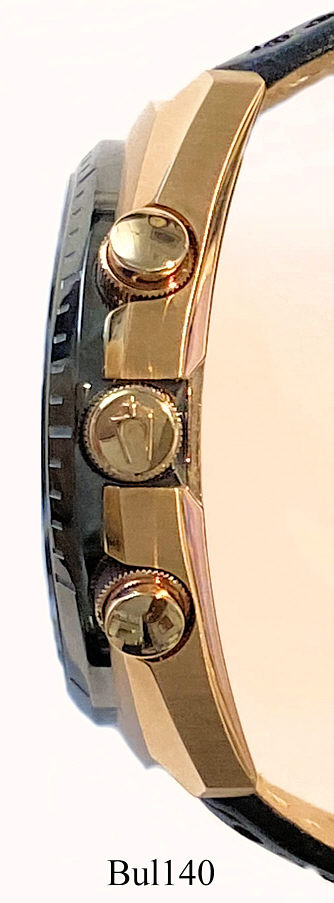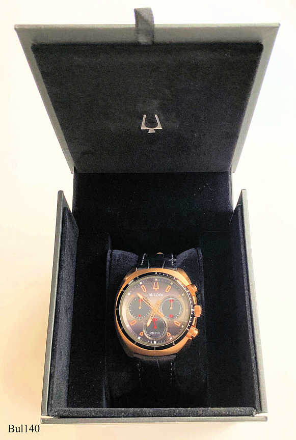 A Bulova Accutron II Chronograph with a 262 KHz quartz movement. Signed front: ”Bulova, 262 KHz”, back: “High Performance Quartz, Bulova, B7, St.Steel, Water Resist, 21139342, 98A156, C477924, Japan Movement, China Band”, inside: ”Bulova, Japan, 8187, Eleven Jewels”. Datecode B7 = 2017, Movement 8187, Stainless Steel case , red gold plated. Black leather band with red gold clasp. As of bulova this is the very first curved quartz chronograph worldwide.