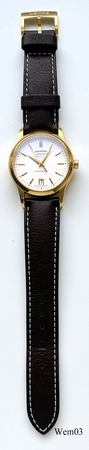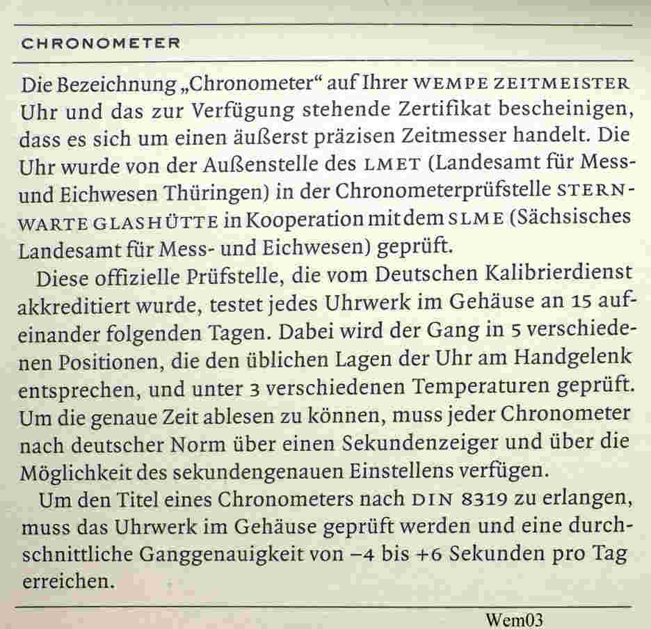 Dies ist ein Herren Automatic Chronometer “Zeitmeister” der Firma Juwelier und Uhrmacher Wempe in Hamburg / Glashütte. Weißes Zifferblatt mit Datum bei der 6. Beschriftet vorn: “Wempe, Zeitmeister, Glashütte i/SA (in Sachsen), Chronometer, Made in Germany”, hinten: ”Sternwarte Wempe, Glashütte i/SA, 360256”, innen :”2892 A2, V8ZK1, Twentyone 21 Jewels, Swiss, 001788, Wempe,”, im Boden: “036-1023, Sip. 59”. Caliber ETA 2892 A2 ,Braunes Lederarmbandsowie mit dem “Full Set”, inklusive Chronometer Zertifikat der Sternwarte Glashütte.
