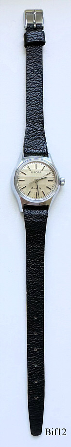 This is a Bifora ladies quartz watch, using the improved unique movement B19 of Bifora, now called B20. Stainless steel case, silver coloured dial with central second hand. Signed front: ” BIFORA, Quartz”, back: ”Stainless Steel Back, Antimagnetic”, Caliber: Bifora B20. Black leather band, introduced 1974.