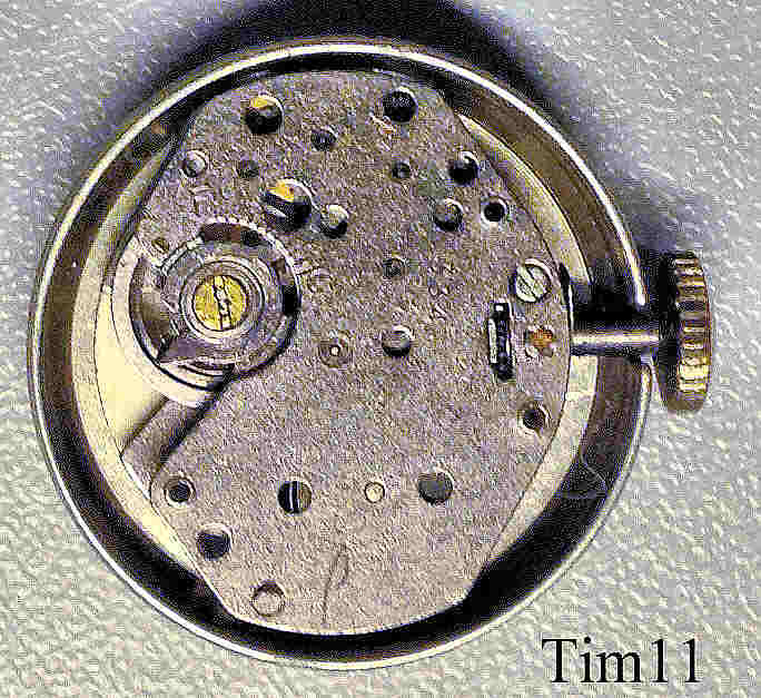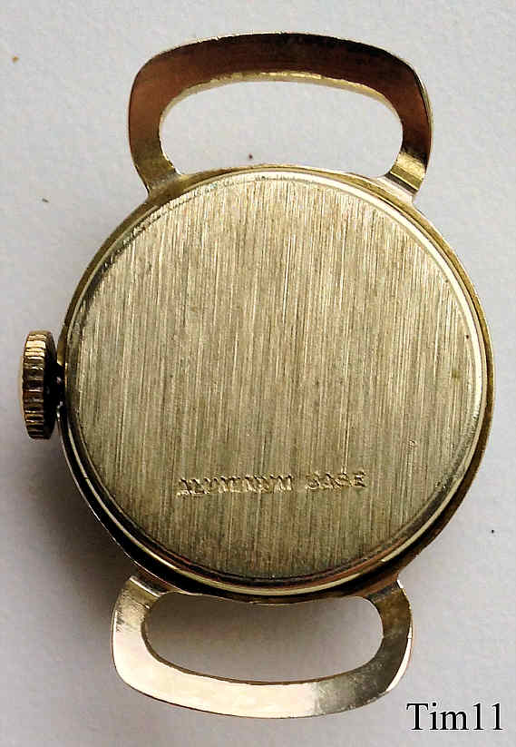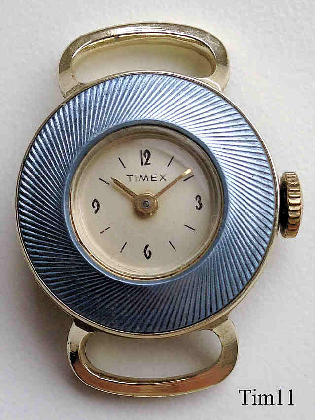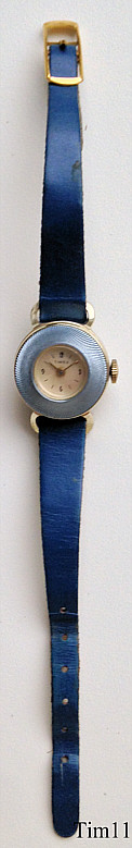 Dies ist eine Timex Damen Handaufzugsuhr mit einem sehr zierlichen Gehäuse mit blauem Lederarmband. Das Gehäuse ist, für die Zeit ungewöhnlich, aus Aluminium gefertigt. Innen läuft ein Timex Kaliber 334