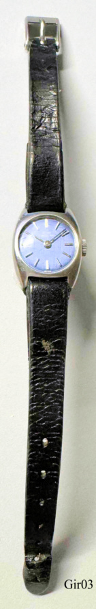 Eine sehr zierliche Girard-Perregaux Damen Handaufzugsuhr im Edelstahl Gehäuse. Blaues Zifferblatt, Beschriftung vorn: “Girard-, Perregaux, -Swiss-”, hinten: “9139 FA”,innen: “650167, 17 Jewels, Swiss, Girard- Perregaux”, inside back: “Stainless steel, Girard-Perregaux, 1791, Swiss, GP Logo”. Schwarzes Lederarmband mit GP Schließe. Uhrwerk GP Z81