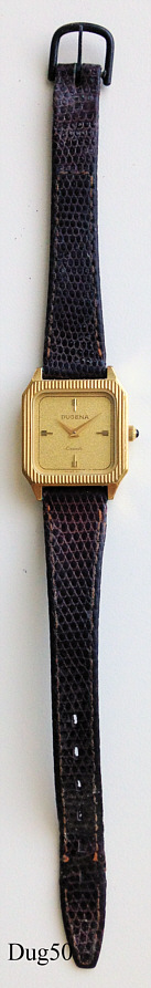 A Dugena ladies dresswatch with gold plated case and Stainless Steel Back. Caliber ETA 961.001. Signed front: “Dugena, Quartz” back: ”Showerproof, Stainless Steel Back, 51075, 512”, inside: ”Five 5 Jewels, Unadjusted, Swiss, ESA, 961.001”.