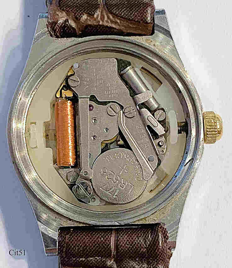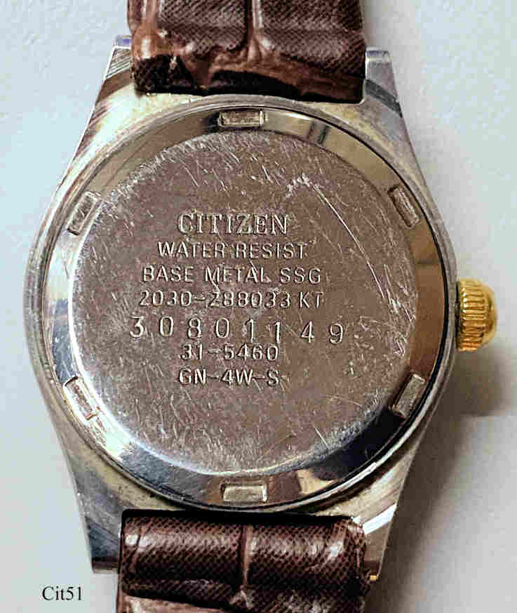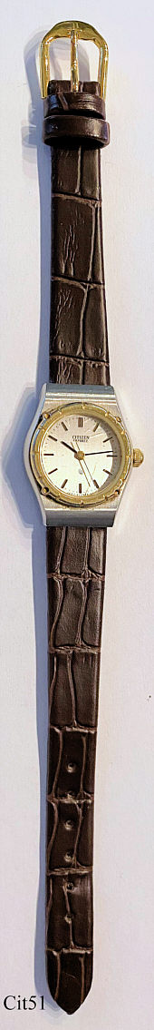 Dies ist eine Citizen Damen Quartz Uhr mit dem 2030A Werk. Beschriftet vorn: ”Citizen, Quartz, CQ”, hinten: ”Water Resist, Base Metal SSG, 2030-288033KT, 30801149, 31-5460, GN-4W-S”, innen: “2030A, One 1 Jewel, Unadjusted, Citizen Watch Co., Japan”. Braunes Leder Armband.