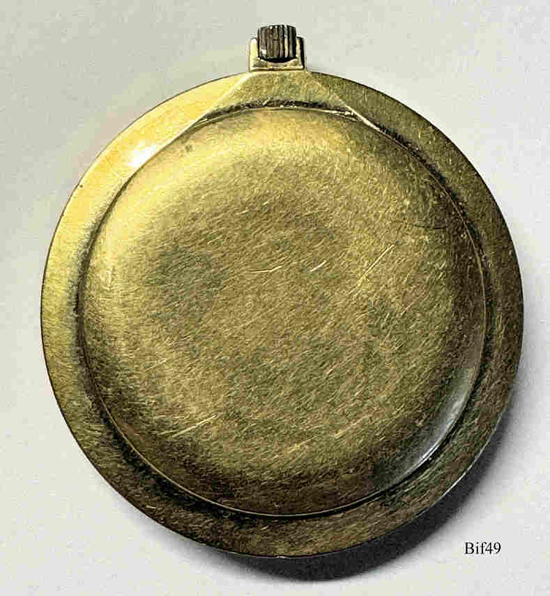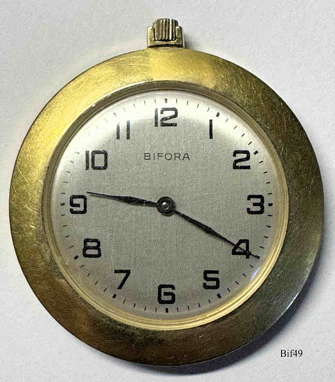 A Bifora ladies pcket clock with the caliber Bifora 91/1. Signed front: ”Bifora”, back: “ “, inside: ”B, 91/1”. Base metal case, 20 µ gold plated. |