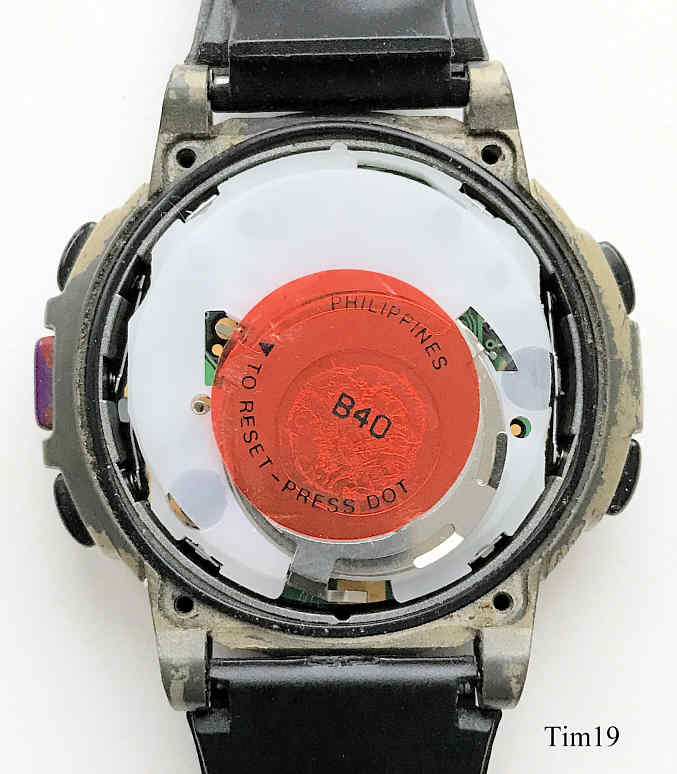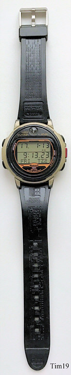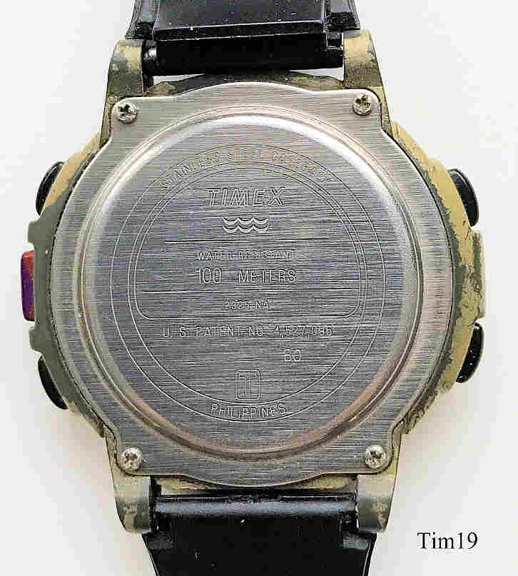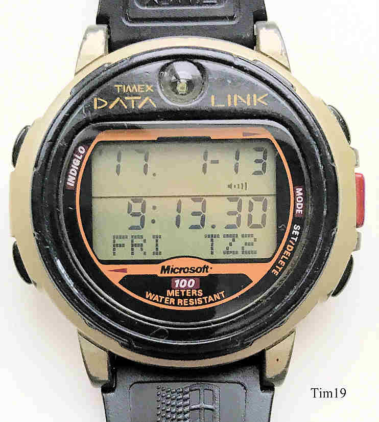 Dies ist eine Timex Data Link 100 Uhr, wohl die Erste Armbanduhr der Welt, die durch kabellosen Datenaustausch mit einem Computer Termine, Adressen und ToDo Listen aus Microsoft Outlook übernehmen und verarbeiten konnte. Der Datentransfer erfolgte über Lichtsignale vom Bildschirm, funktioniert deshalb auch nur mit CRT Bildschirmen. Die Empfangsstation ist die runde Photozelle zwischen Data und Link. Beschriftet vorn: ”Timex, Data Link, Microsoft, 100 Meters, Water resistant”. Auf der Rückseite: ”Timex,Water Resistant 100 Meters, 2025 NA, US Pat. No. 4.527.096, Phillipines, Stainless Steel Caseback”.