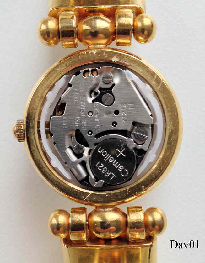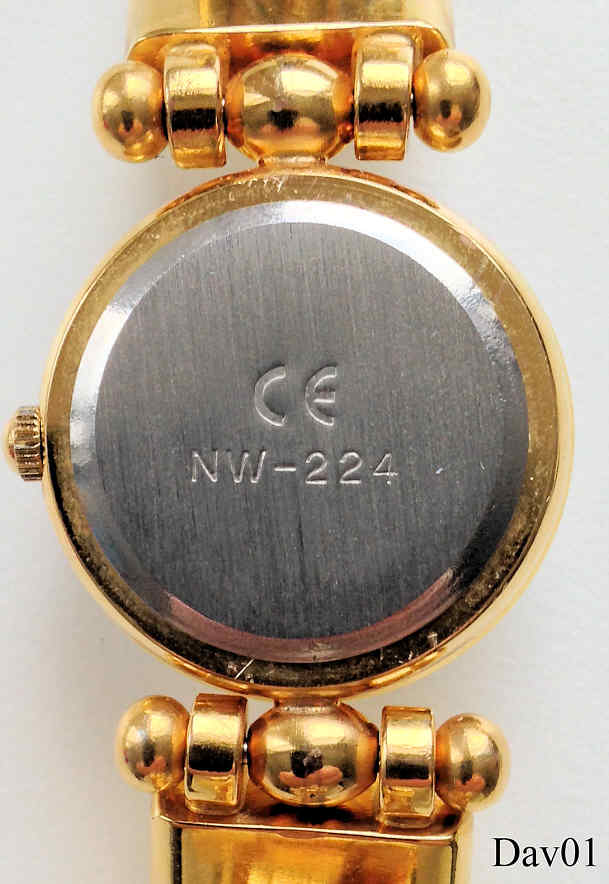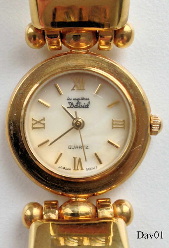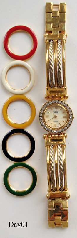 Eine Designuhr der Marke David, Modell “Les Mystères de David”. Die Uhr kann durch unterschiedliche Farbringe im Aussehen stark verändert werden. Beschriftung: “Les Mystéres de David, Quartz, Japan Movt”, hinten: “CE, NW-224”, innen: “TMI Japan, Time Module Inc., No Jewels, Y121E”. Kaliber TMI Y121E.