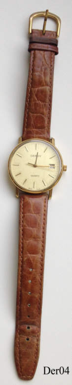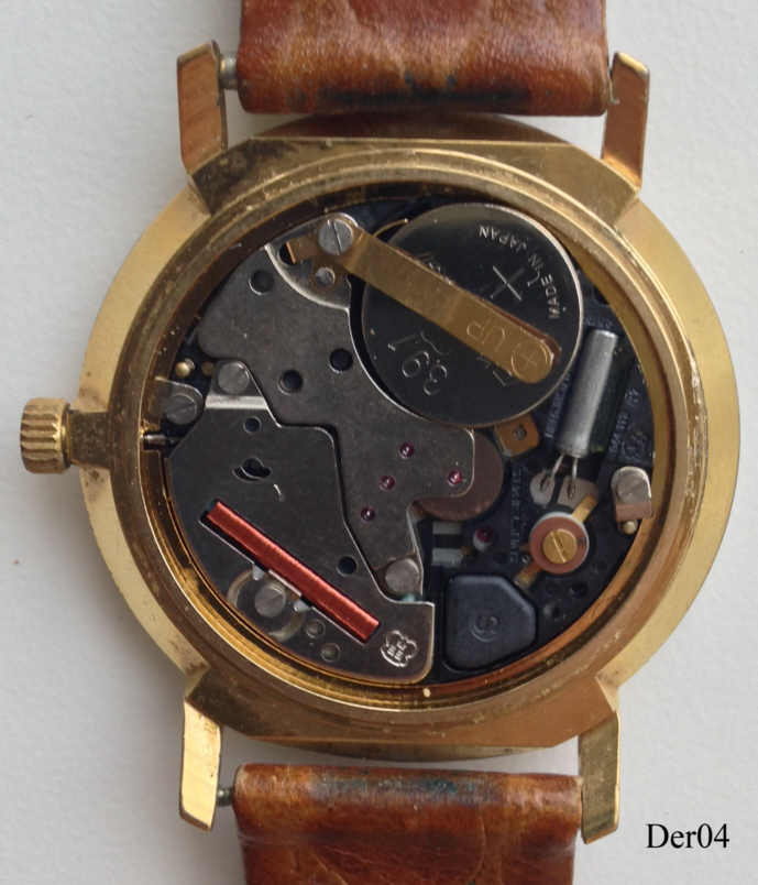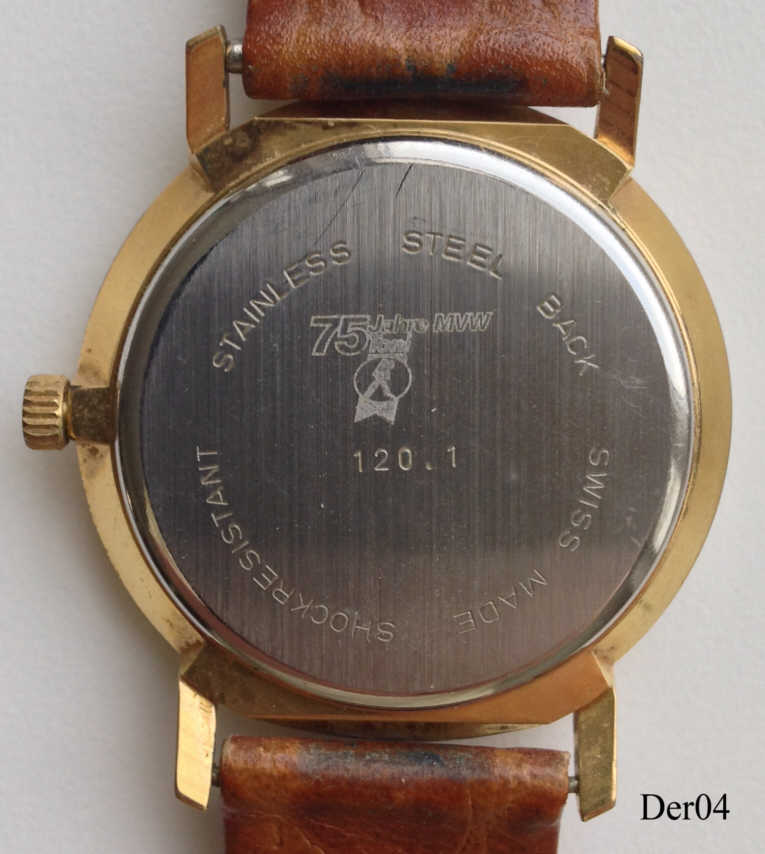 Dies ist eine Derby Quartzuhr mit vergoldetem Gehäuse, zum 75. Jübiläum der Firma MVW. Bezeichnung vorn: ”Derby, Quartz, Swiss Made”, hinten: “Stainless Steel Back, Swiss Made, Shockresistant, 75 Years MVW, Toni, 120.1”, innen: “ETA 944.111”Brauners Lederarmband.