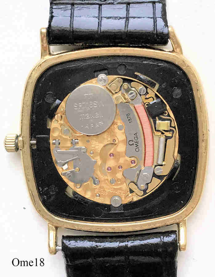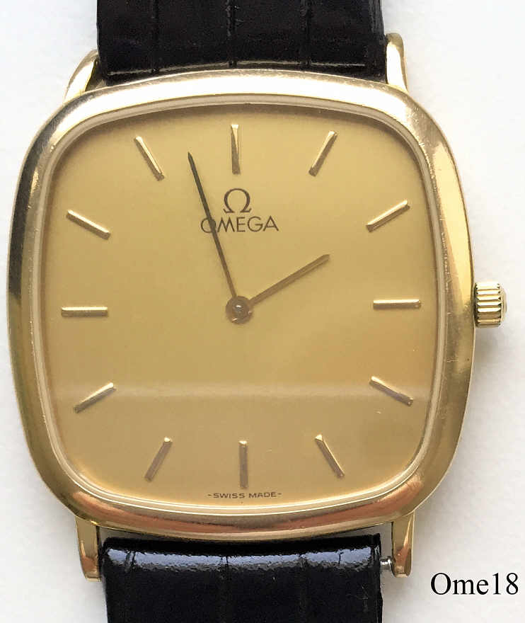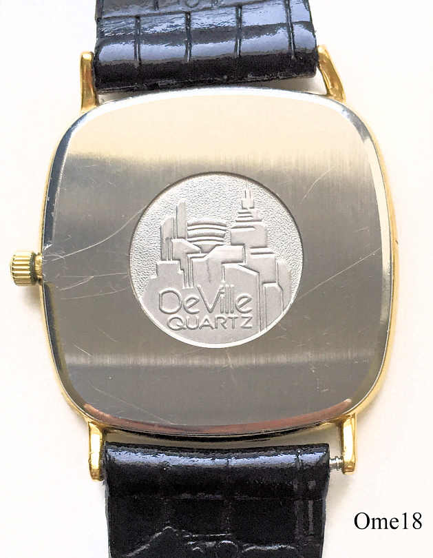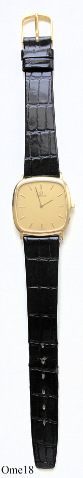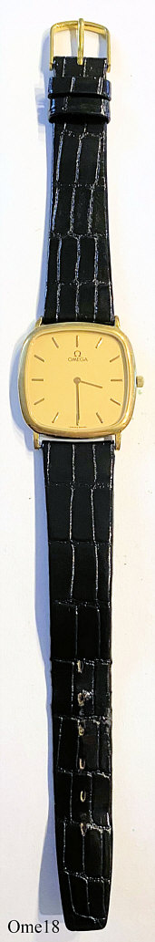 Dies ist eine Omega DeVille Schmuckuhr mit vergoldetem Gehäuse und Edelstahl Boden. Beschriftet vorn: “Omega, Swiss Made”, innen: “Omega, 1378, ETA 210.001, 8 Jewels, 50183809”, hinten: ”DeVille, Quartz” Die Uhr ist nur 4mm dick, schwarzes Eidechsarmband.