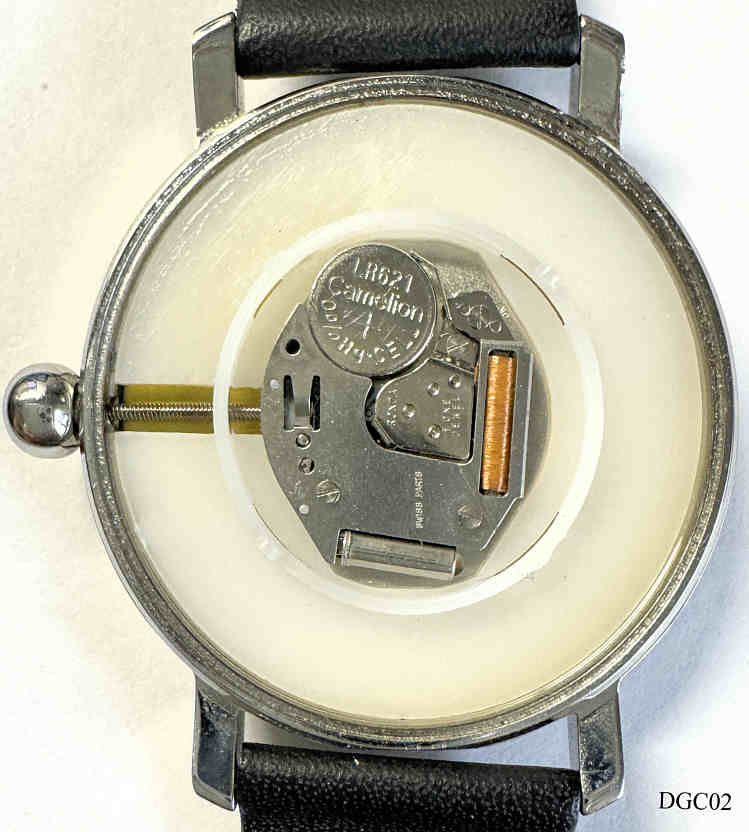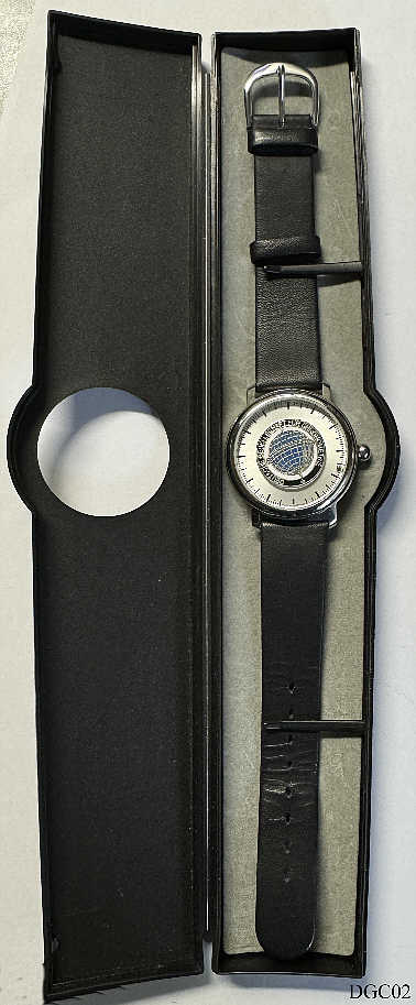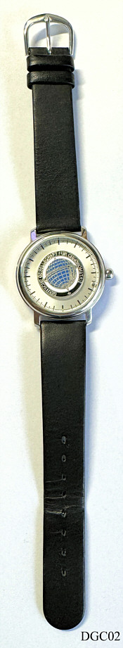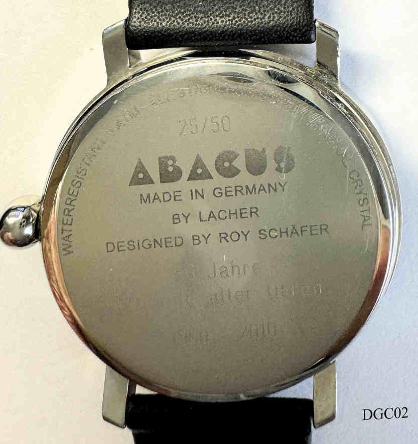 Die Deutsche Gesellschaft fr Chronometrie (DGC) wurde als Verein 1949 gegrndet und wurde 1960 neu strukturiert aus der “Gesellschaft fr Zeitmesskunde und Uhrentechnik“ von 1926 und dem Arbeitskreis ”Freunde alter Uhren” von 1960. Diese Uhr wurde 2010 zum 50. Jubilum mit 50 Stck heraus gegeben. Es ist eine Einzeiger Uhr mit einer Kugel statt dem Zeiger. Die Kugel wird durch einen Magneten in Positon gehalten. Beschriftet vorn: ”Deutsche Gesellschaft fr Chronometrie”, hinten: ”Abacus, Made in Germany, By Lacher, Designerd by Roy Schfer, 25/ 50, 50 Jahre Freunde alter Uhren, 1960 - 2010, Mineral Crystal, 3 ATM, All Stainless Steel”, Schwarzes Lederband. Die passende Herrenuhr ist hier