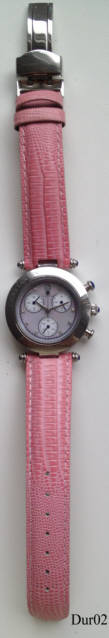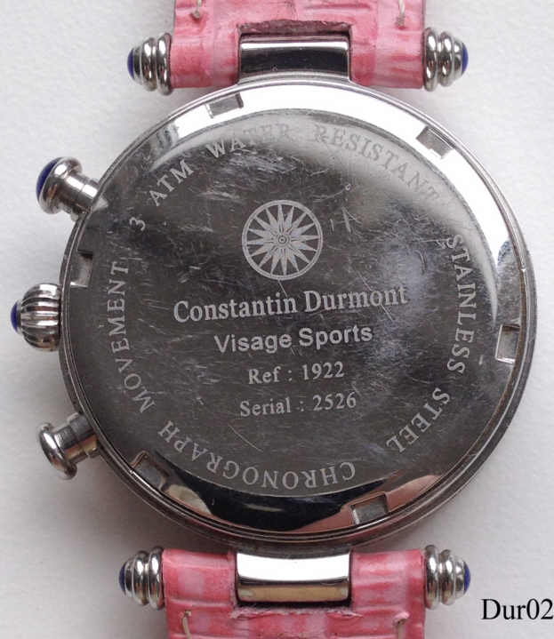 A Constantin Durmond Quartz chronograph as ladies dresswatch. Calendar at 12, mother of pearl dial with diamond points as numbers. Movement Miyota Caliber FS00. Signed front: “Constantin Durmond Diamond”, back: “Stainless Steel, Chronograph Movement, 3 ATM Water Resistant, Constantin Dumond, Visage Sports, Ref: 1922, Serial: 2526”, inside: “FS00, Miyota Co., No Jewels, Japan”. Rose Leather band.