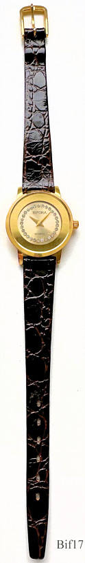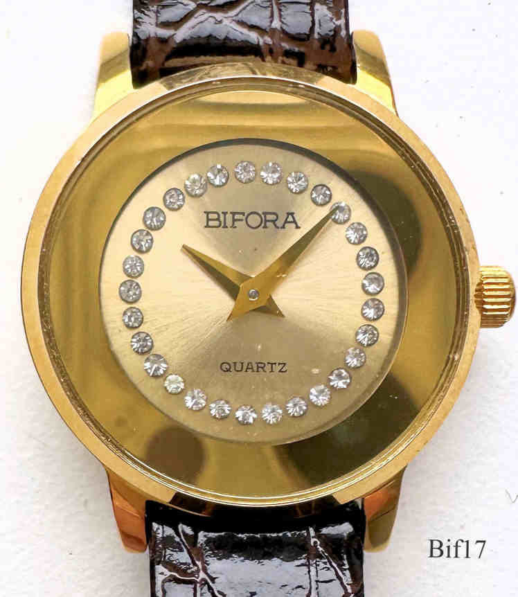 This is a Bifora ladies quartz watch, using a PUW 900E movement and a brown croc leather band. Gold plated case, gold ring around the minute circle of small crystal points, no central seconds hand. Signed front: ” BIFORA, Quartz”, back: ”Stainless Steel Back ”, inside: “Unadjusted, PUW 900E, six (6) Jewels”. Brown lizard leather band.